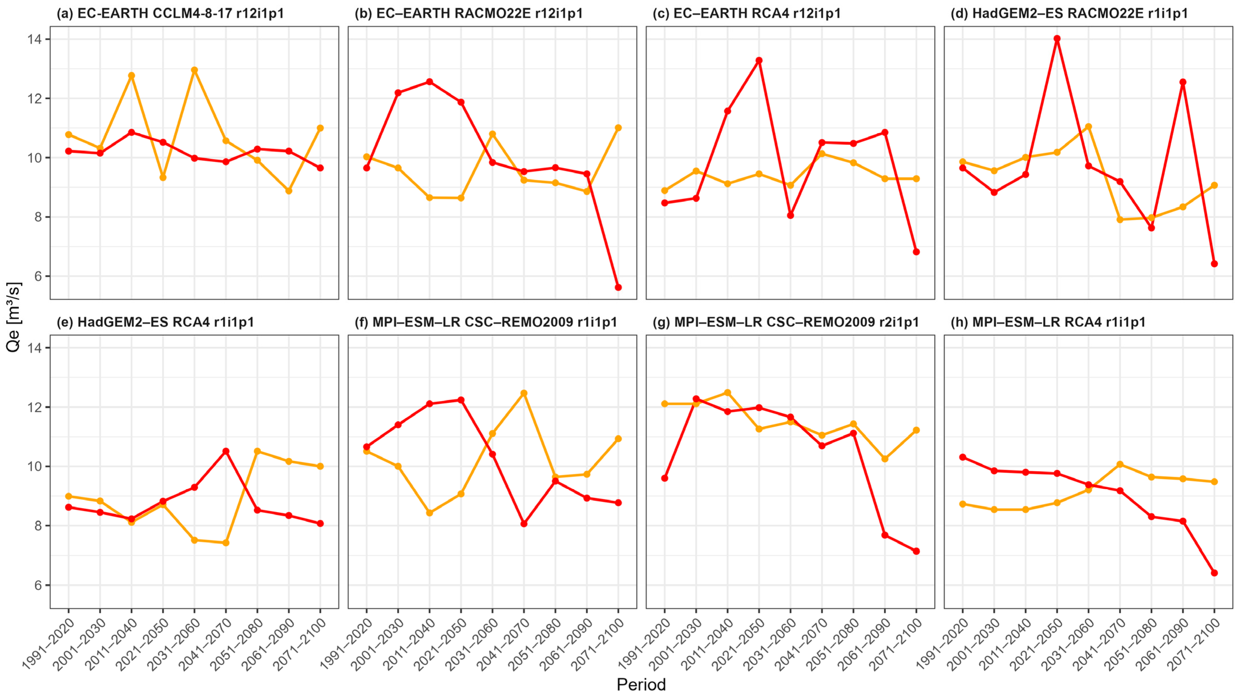 - EP1 (up to 2050)—Qe8.5 significantly increase and Qe4.5 slightly decrease. In the RCP 8.5 scenario, the riverbed may degrade through erosion processes (incision and/or bank erosion processes), in a channel which is already highly affected by these processes, as the study of Radu and Comănescu [34] highlights. For RCP 4.5, no significant changes are estimated, as Qe4.5 variability is low.