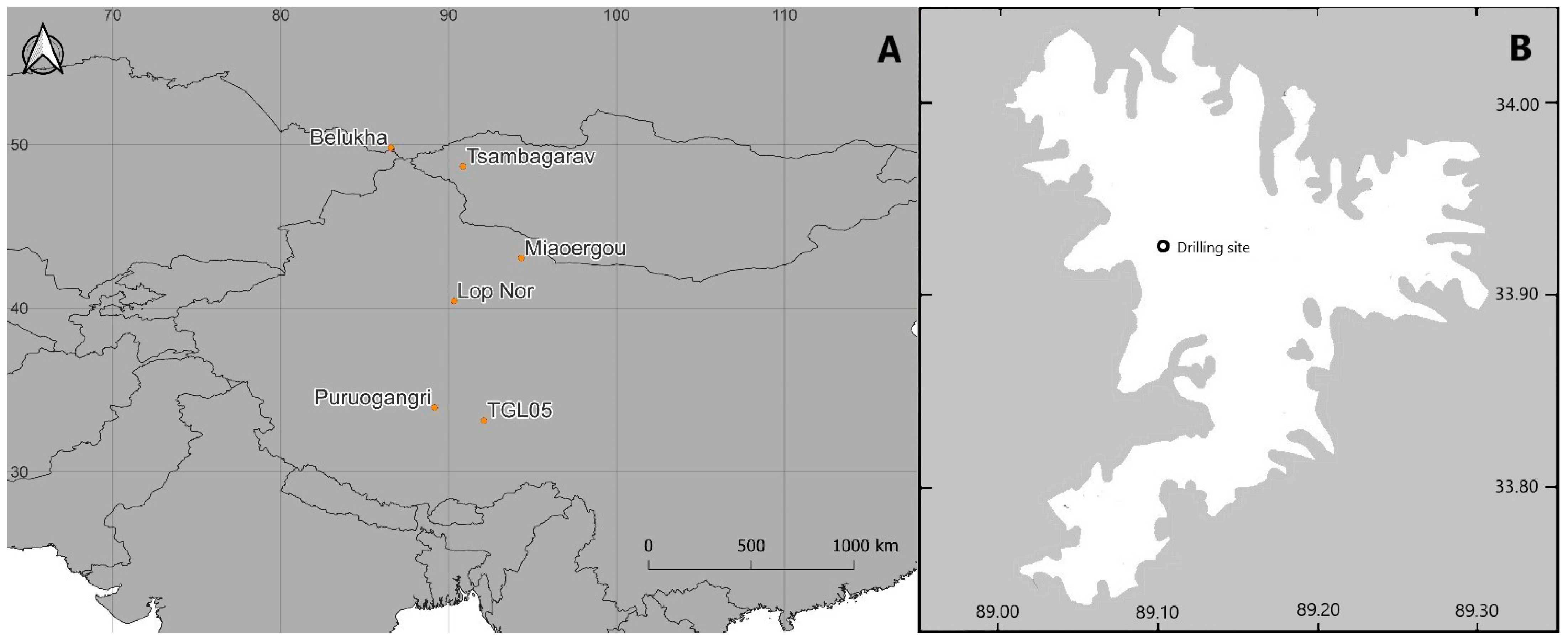 - Shao, L.; Tian, L.; Wu, G.; Naftz, D.; Cai, Z.; Wang, C.; Li, Y.; Palcsu, L. Dating of an alpine ice core from the interior of the Tibetan Plateau. Quat. Int. 2020, 544, 88–95. [Google Scholar] [CrossRef]
