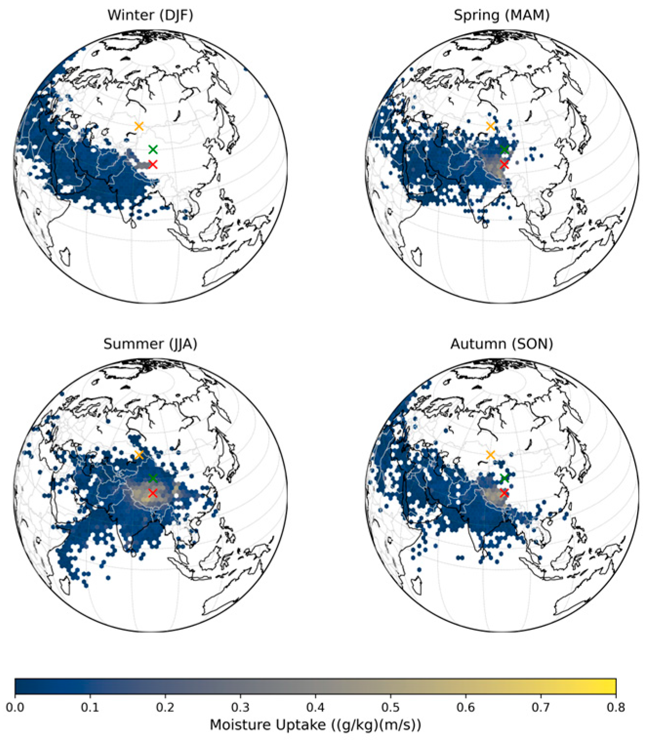 - Joswiak, D.R.; Yao, T.; Wu, G.; Tian, L.; Xu, B. Ice-core evidence of westerly and monsoon moisture contributions in the central Tibetan Plateau. J. Glaciol. 2013, 59, 56–66. [Google Scholar] [CrossRef]