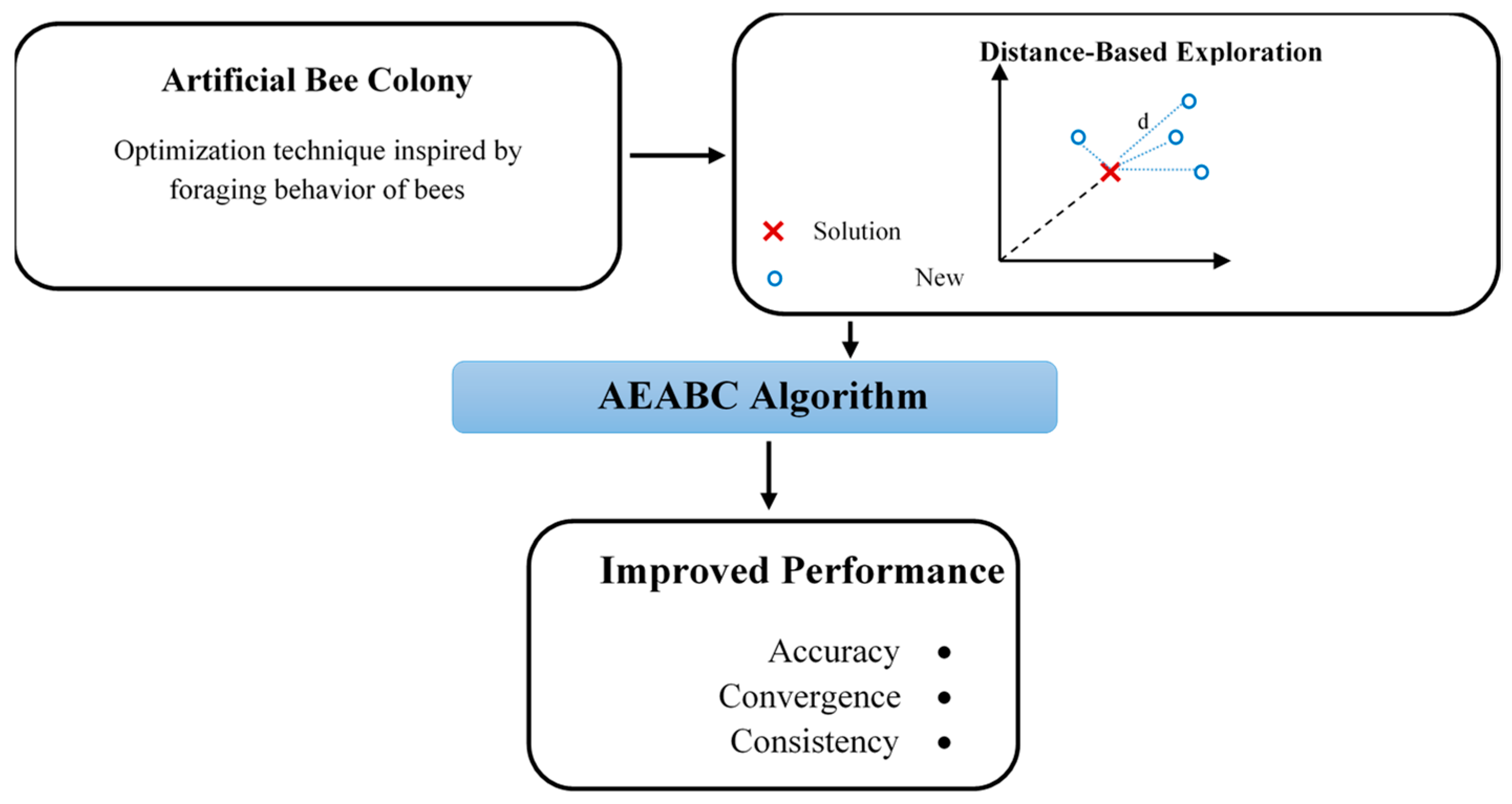 Figure 1 provides a conceptual overview of the AEABC algorithm, illustrating how introducing a distance-based exploration mechanism modifies the classical Artificial Bee Colony framework and improves convergence accuracy, stability, and consistency.