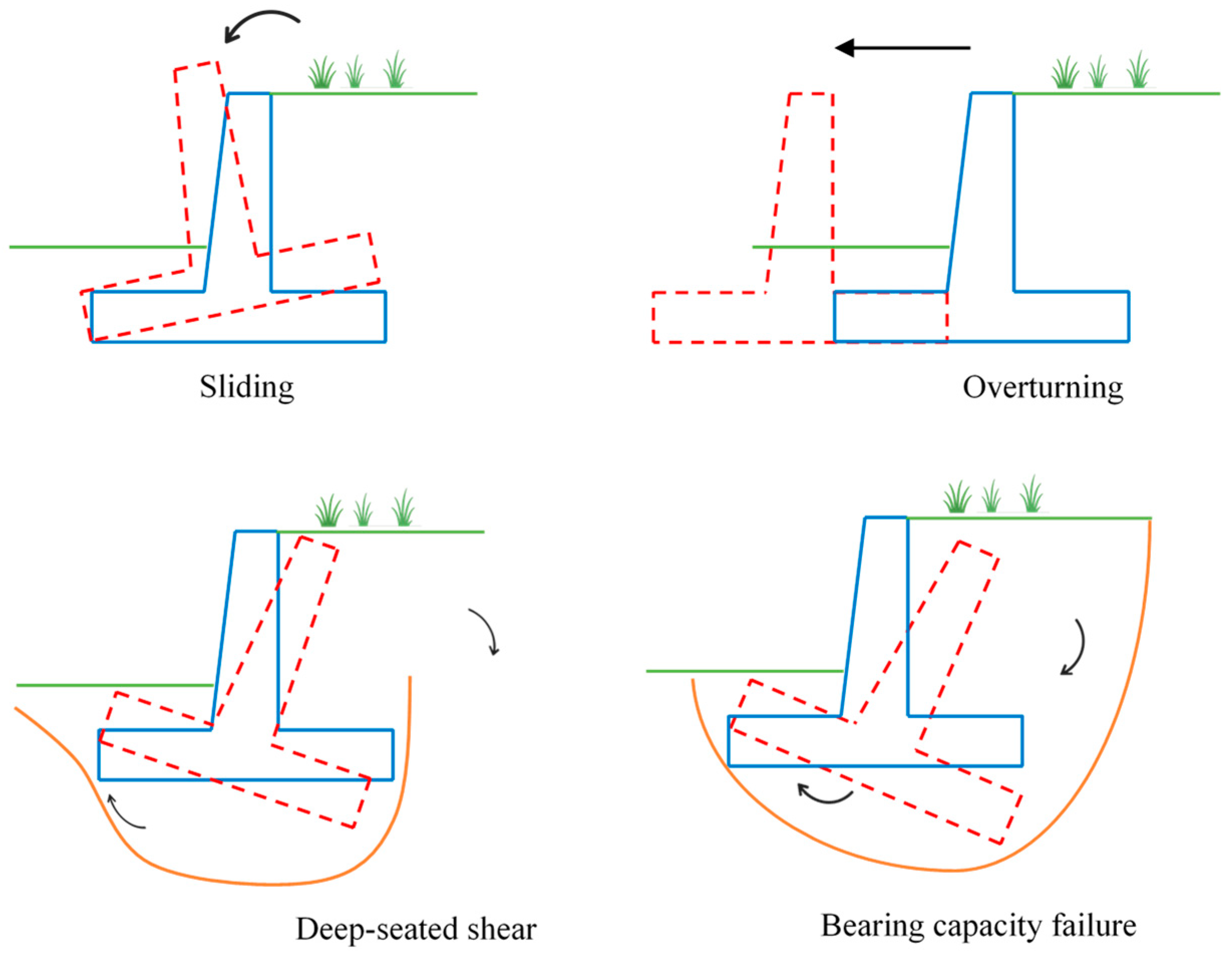 In the case of an overturning failure mode, the wall must be prevented from rotating around its toe by ensuring that the moments induced by vertical forces (stabilizing moments) exceed those induced by horizontal forces (overturning moments). The weight of the wall primarily generates the stabilizing moments, while the main cause of overturning moments is the earth’s pressure acting on the wall. Overturning failure occurs when the lateral earth pressures on the wall exceed the wall’s resistance, causing it to overturn.
