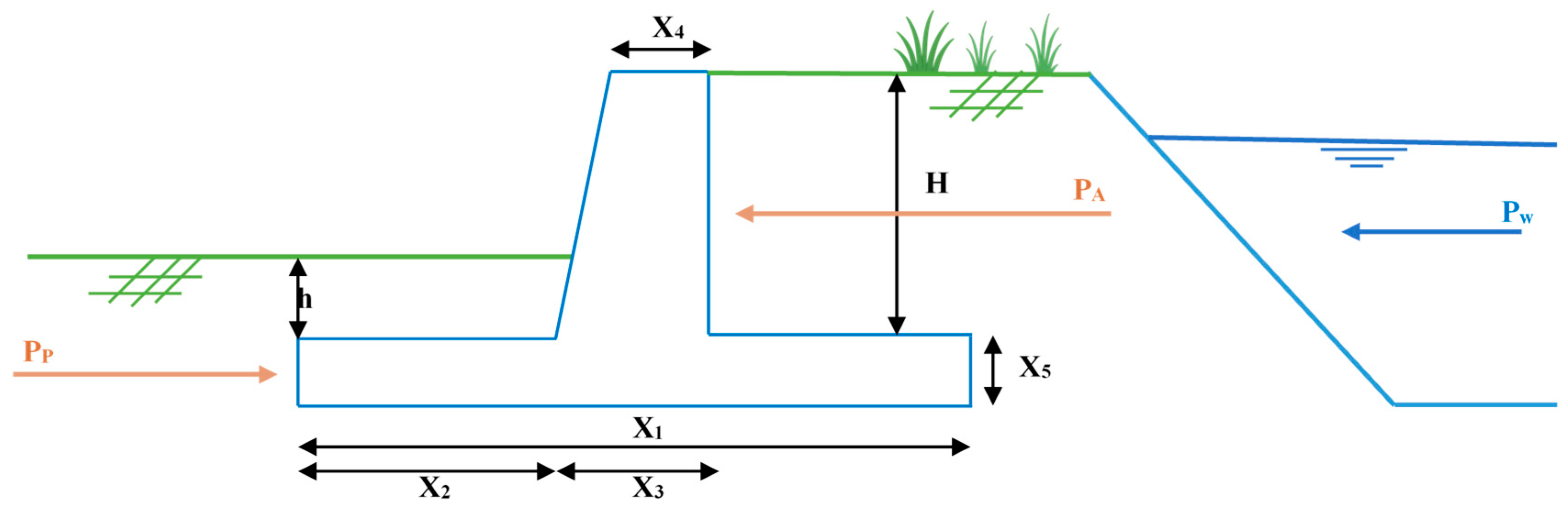 Figure 3 illustrates the geometric configuration of the gravity retaining wall and defines the five primary design variables (