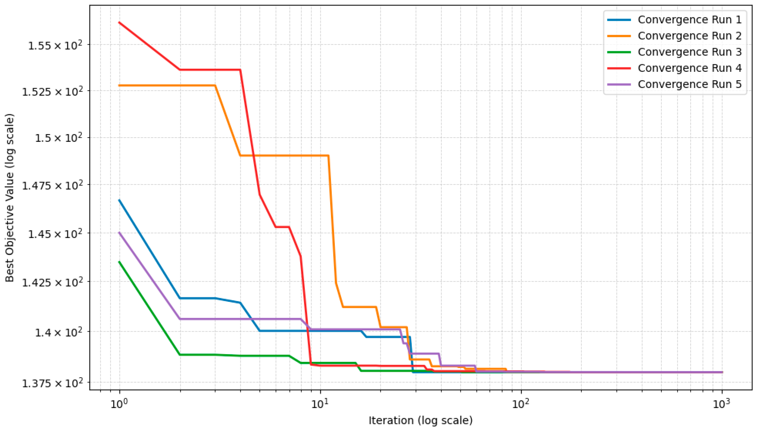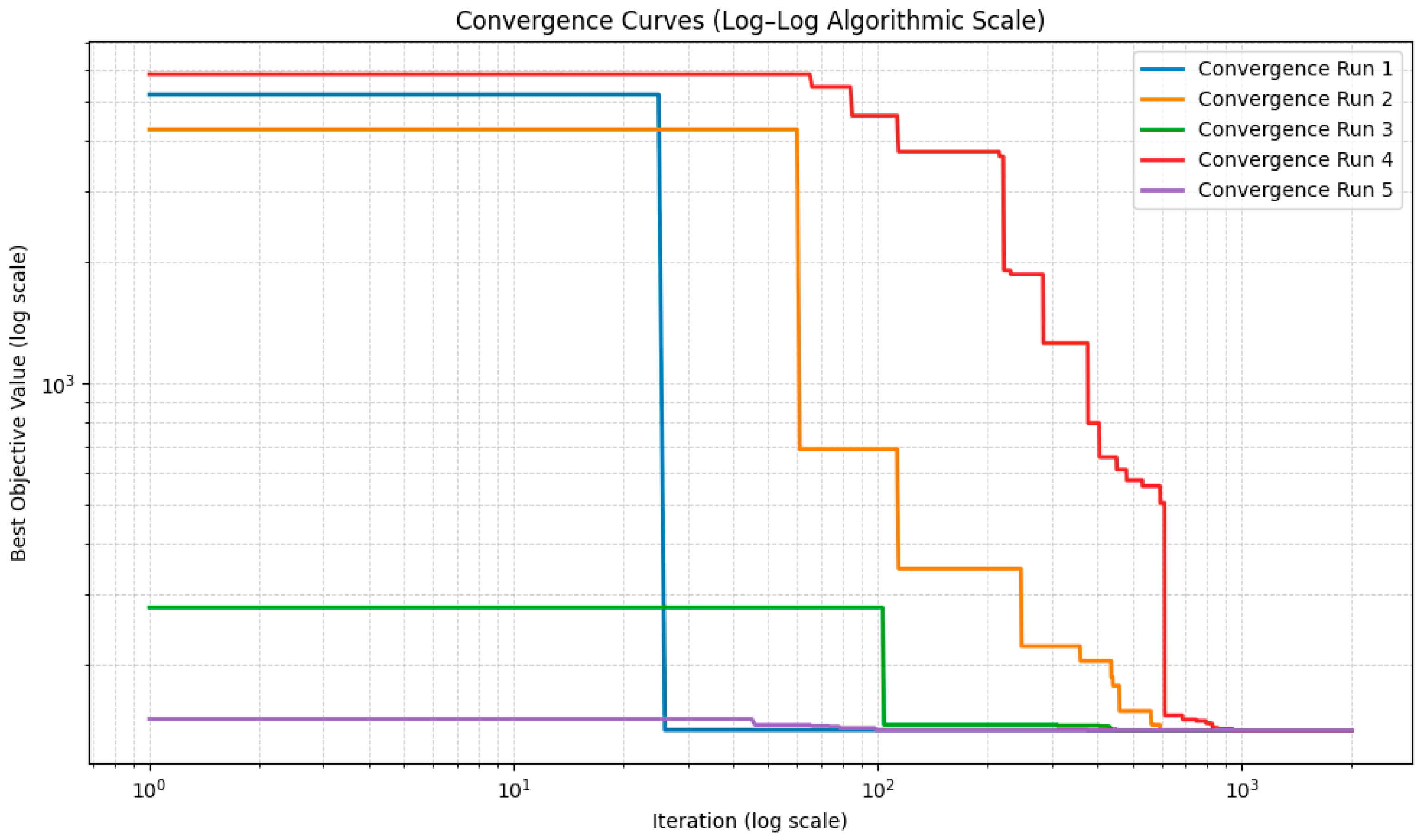 Figure 5 illustrate five arbitrarily selected convergence curves for the AEABC and FFO algorithms, respectively. Although only a subset of runs is shown for clarity, the plotted curves are representative of the overall convergence behavior observed across all independent runs.