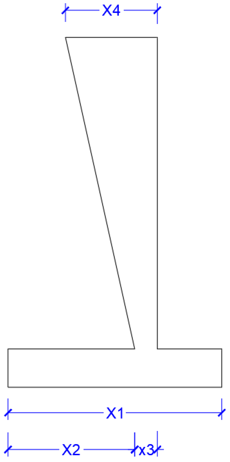 To guarantee a positive heel width and avoid degenerate base geometries, the sum of the toe projection and the bottom stem thickness is constrained not to exceed the total base width. This constraint ensures that the heel region remains physically meaningful and that the soil backfill contributes correctly to stabilizing moments: