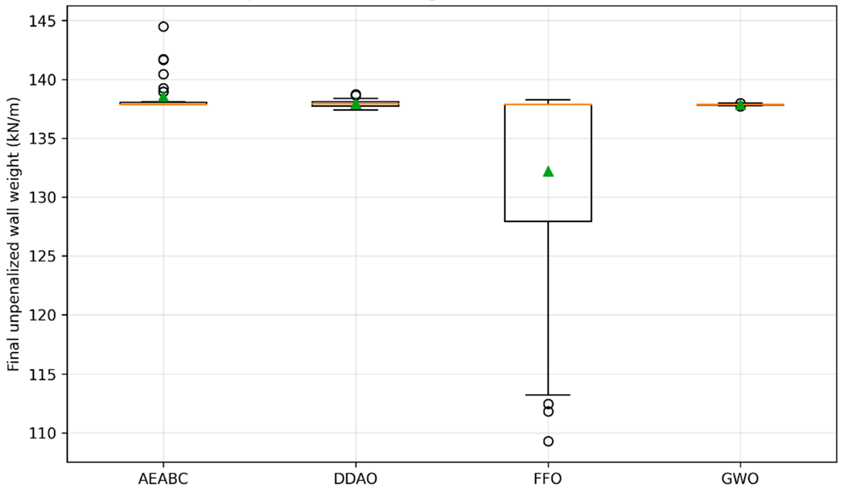 Figure 8 presents box plots of the final unpenalized wall weight obtained from 30 independent runs of each feasible optimization algorithm. The relatively narrow interquartile ranges and the close agreement between medians and means observed for AEABC, DDAO, and GWO indicate consistent convergence behavior under the adopted population size and iteration budget, suggesting limited stochastic variability for these solvers. In contrast, the FFO algorithm exhibits a noticeably wider interquartile range, extended whiskers, and several low-weight realizations, resulting in the lowest median and mean wall weights among all methods. This behavior reflects an aggressive search strategy that frequently drives solutions toward stability and feasibility boundaries, at the cost of increased variability. The AEABC algorithm produces slightly higher wall weights but demonstrates a tightly clustered distribution with reduced dispersion, indicating conservative convergence within stable feasible regions. DDAO and GWO display intermediate behavior, balancing convergence stability with moderate material efficiency. Overall, the observed distributions reveal a systematic trade-off between material efficiency and robustness under constraints, rather than the dominance of a universally superior optimization algorithm.