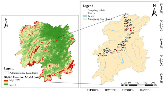 The Xiangjiang River Basin is located in Hunan Province, China, and represents the largest inflowing river system of Dongting Lake (25°00′~29°00′ N; Figure 1). The main stem of the Xiangjiang River extends approximately 856 km, draining a catchment area of 94,721 km2 [30,31]. The river contributes about 39.2% of the total inflow to Dongting Lake, highlighting its importance in regulating lake water quantity and nutrient inputs.