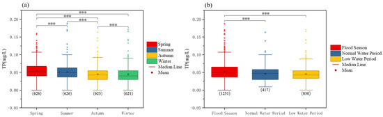 (a) Seasonal variation of average TP concentration at each sampling point. (b) Variation of Average TP Concentration at Each Sampling Point by Hydrological Period. *** indicates p < 0.001.).