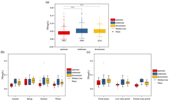 (a) Changes in TP concentration in upstream, midstream, and downstream. (b) Changes in TP concentration in upstream, midstream, and downstream across different seasons. (c) Changes in TP concentration in upstream, midstream, and downstream across different hydrological periods. *** indicates p < 0.001.).