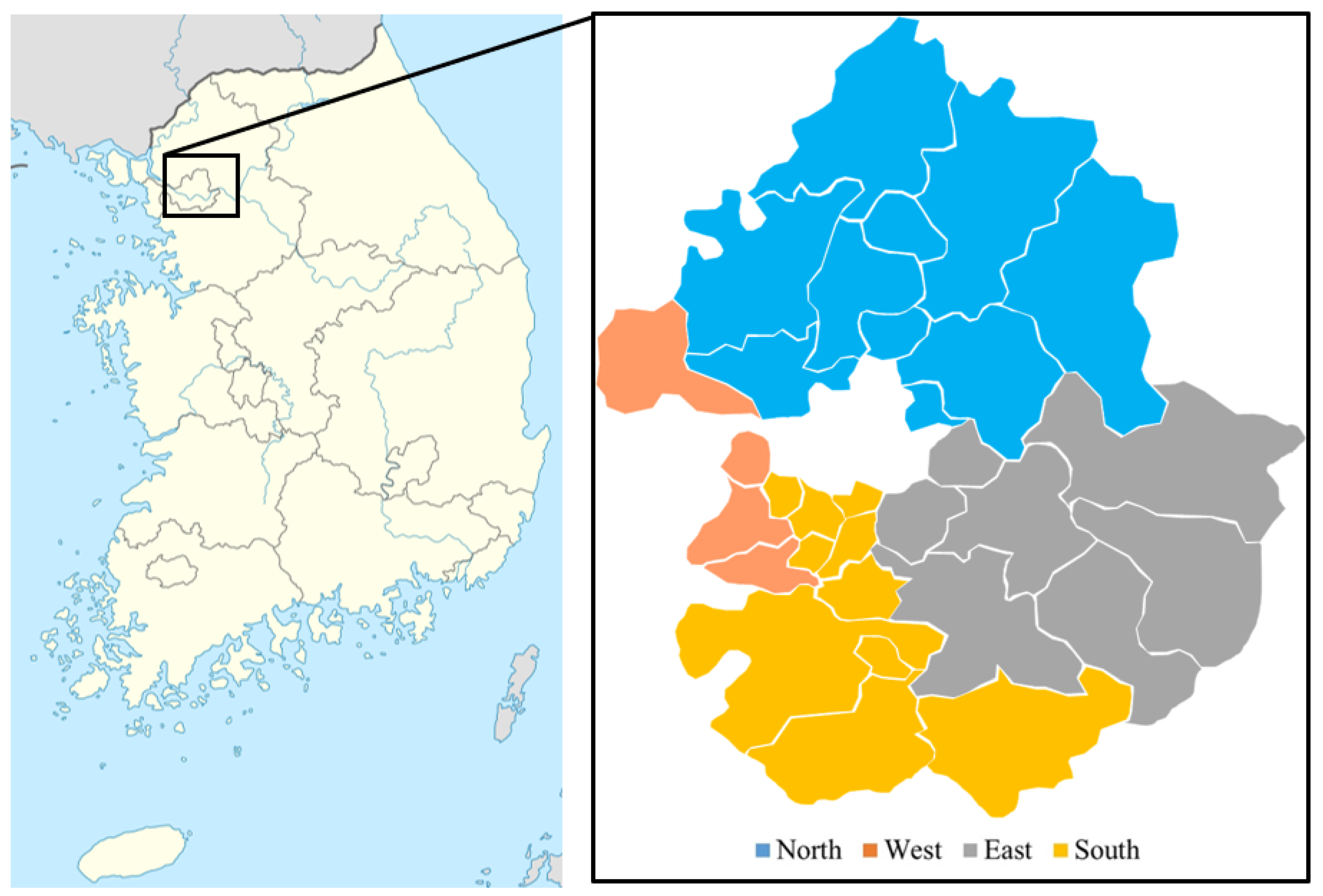 To analyze spatial patterns, each case was assigned to one of four main administrative zones within Gyeonggi Province, north, east, west, or south, as shown in