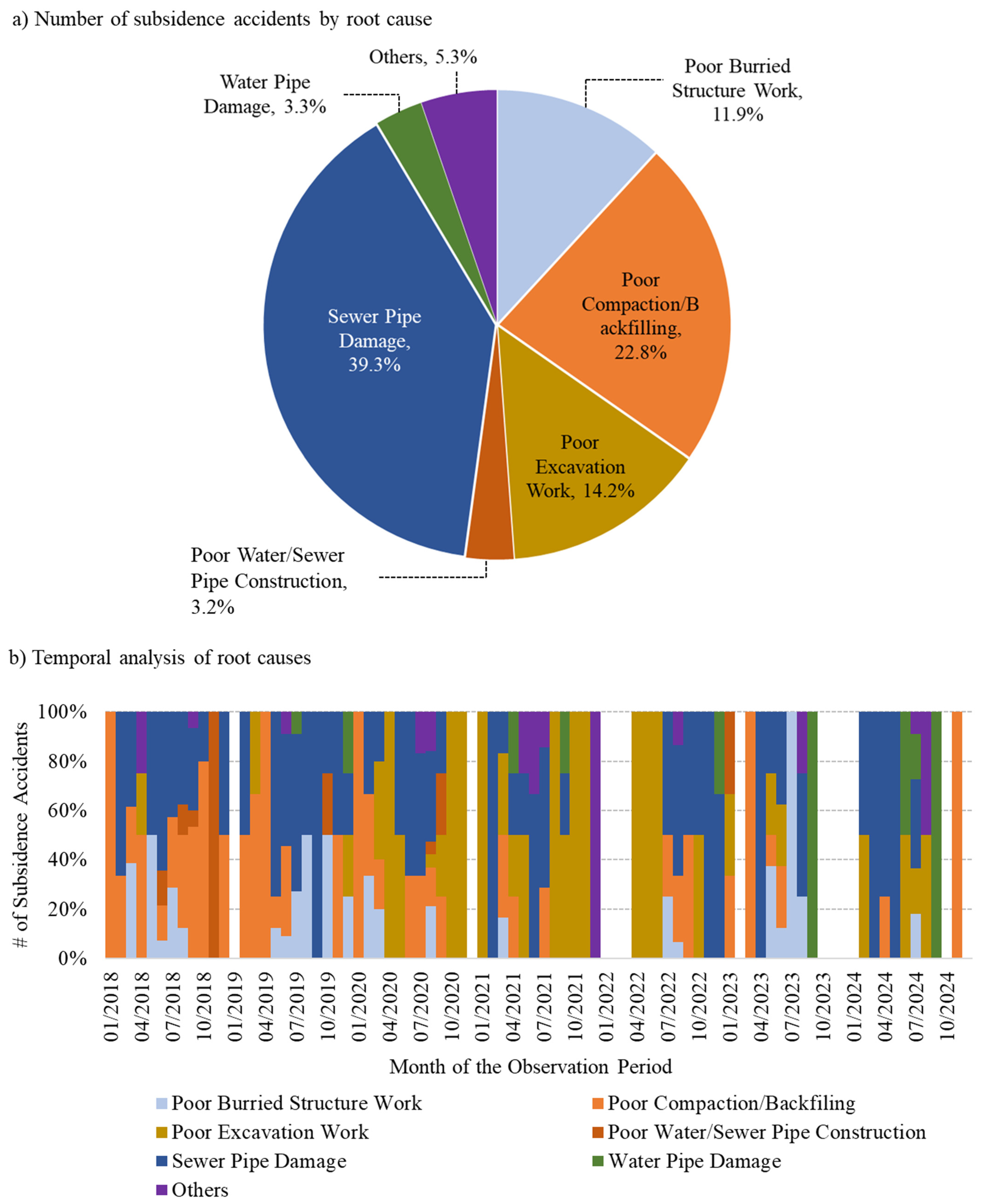 Figure 3a presents the distribution of incidents by root cause. ‘Sewer Pipe Damage’ was the most frequently reported cause, responsible for 39.3% of the total cases. ‘Poor Compaction or Backfilling’ and ‘Poor Excavation Work’ followed, accounting for 22.8% and 14.2%, respectively. At the other end of the spectrum, ‘Poor Water or Sewer Pipe Construction’ appeared in only 3.2% of the cases, making it the least common cause identified in the dataset. Examining the monthly distribution of root causes (
