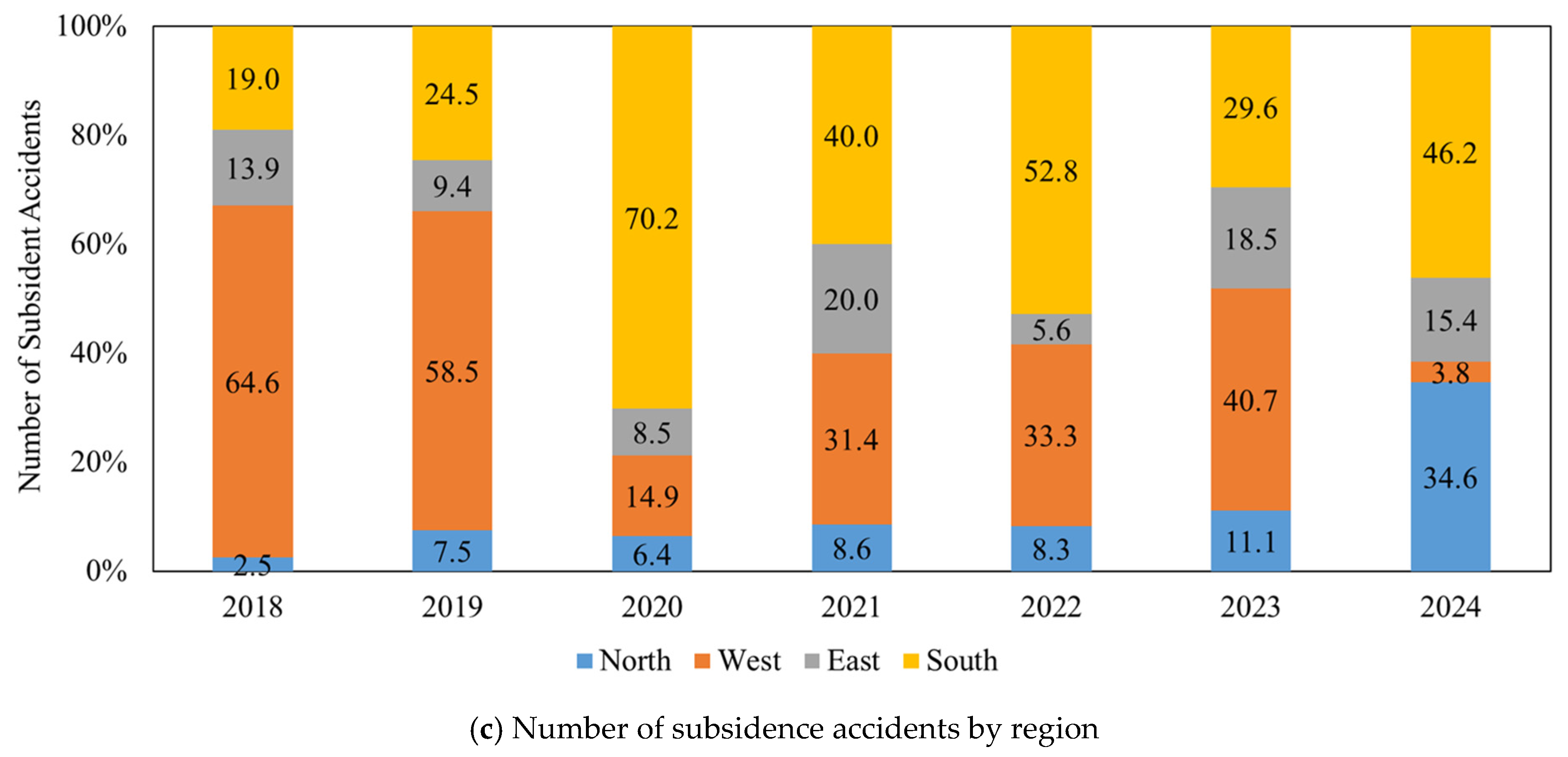 Figure 4a). Across all seven years, the majority of accidents occurred during the summer months, with particularly high concentrations noted in several years: 36.7% in 2018, 45.2% in 2019, 59.5% in 2020, 31.4% in 2021, 63.8% in 2022, 48.1% in 2023, and 57.6% in 2024. This recurring pattern suggests a strong correlation between seasonal climate conditions, especially heavy rainfall during the monsoon season in July and August (summer), and the occurrence of ground subsidence. In contrast, subsidence accidents were significantly less frequent during the winter months. For each year of the observation period, winter accounted for the smallest share of incidents: 11.3% in both 2018 and 2019, 8.5% in 2020 and 2021, 8.3% in 2022, 11.1% in 2023, and just 7.6% in 2024.