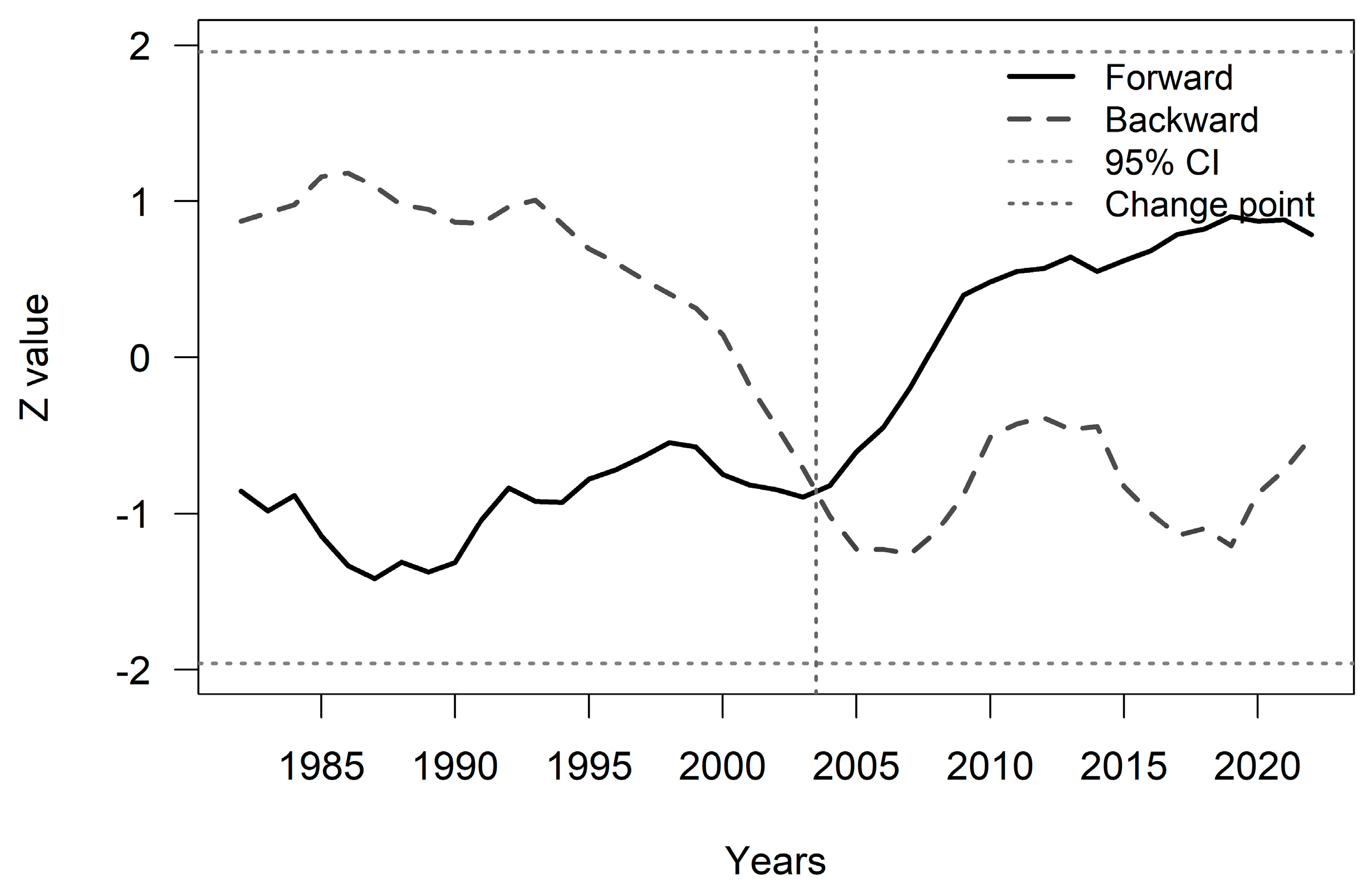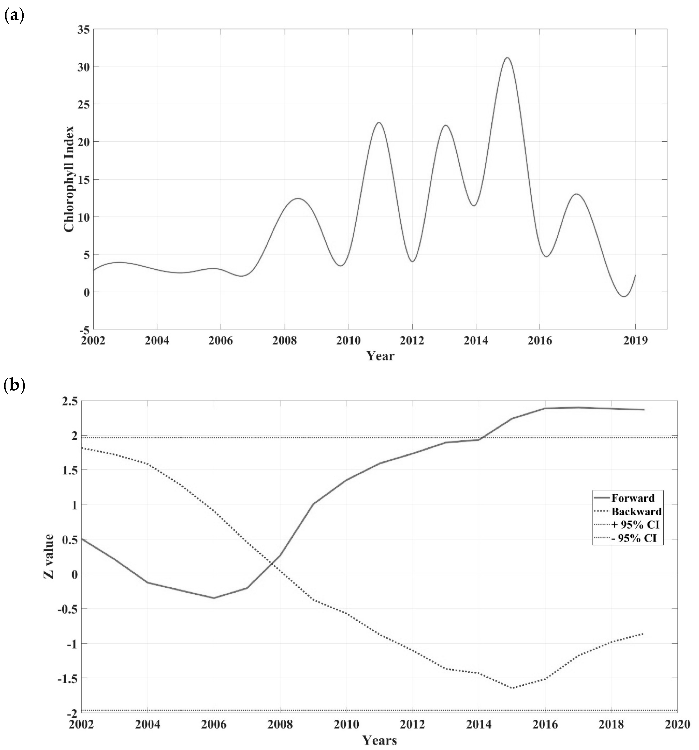 3.2.1. Sequential Mann–Kendall Forward and Backward Trends