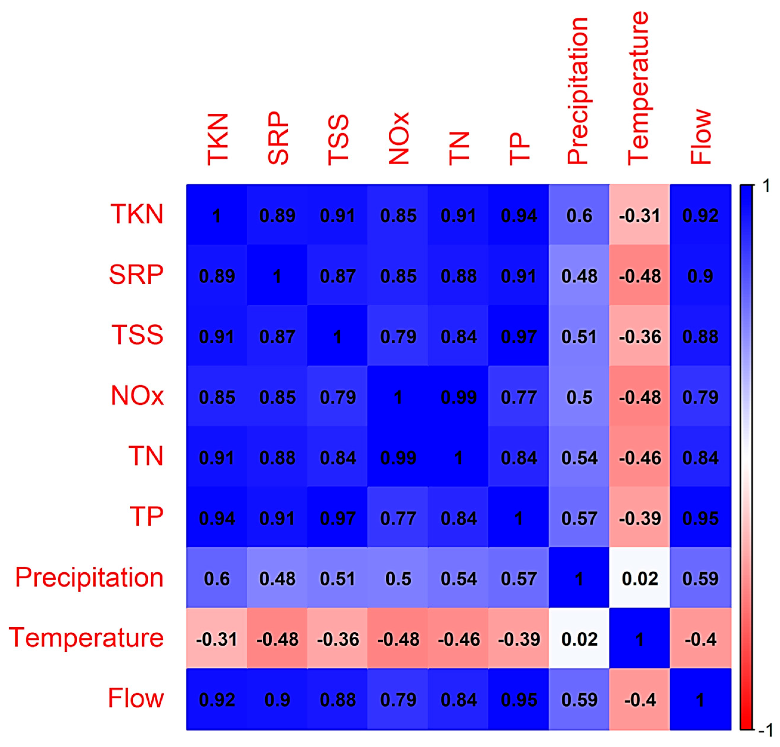 | TKN | SRP | TSS | NOx | TN | TP | P | T | Flow |