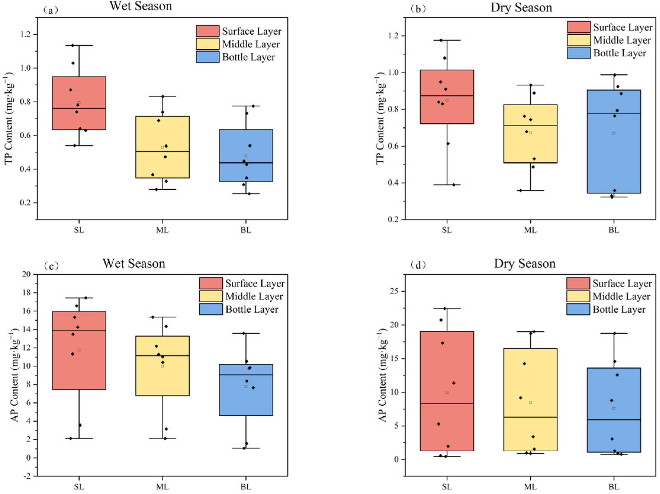 | Sampling Sites | Wet Period TP (g·kg−1) | Wet Period AP (mg·kg−1) | Dry Period TP (g·kg−1) | Dry Period AP (mg·kg−1) |