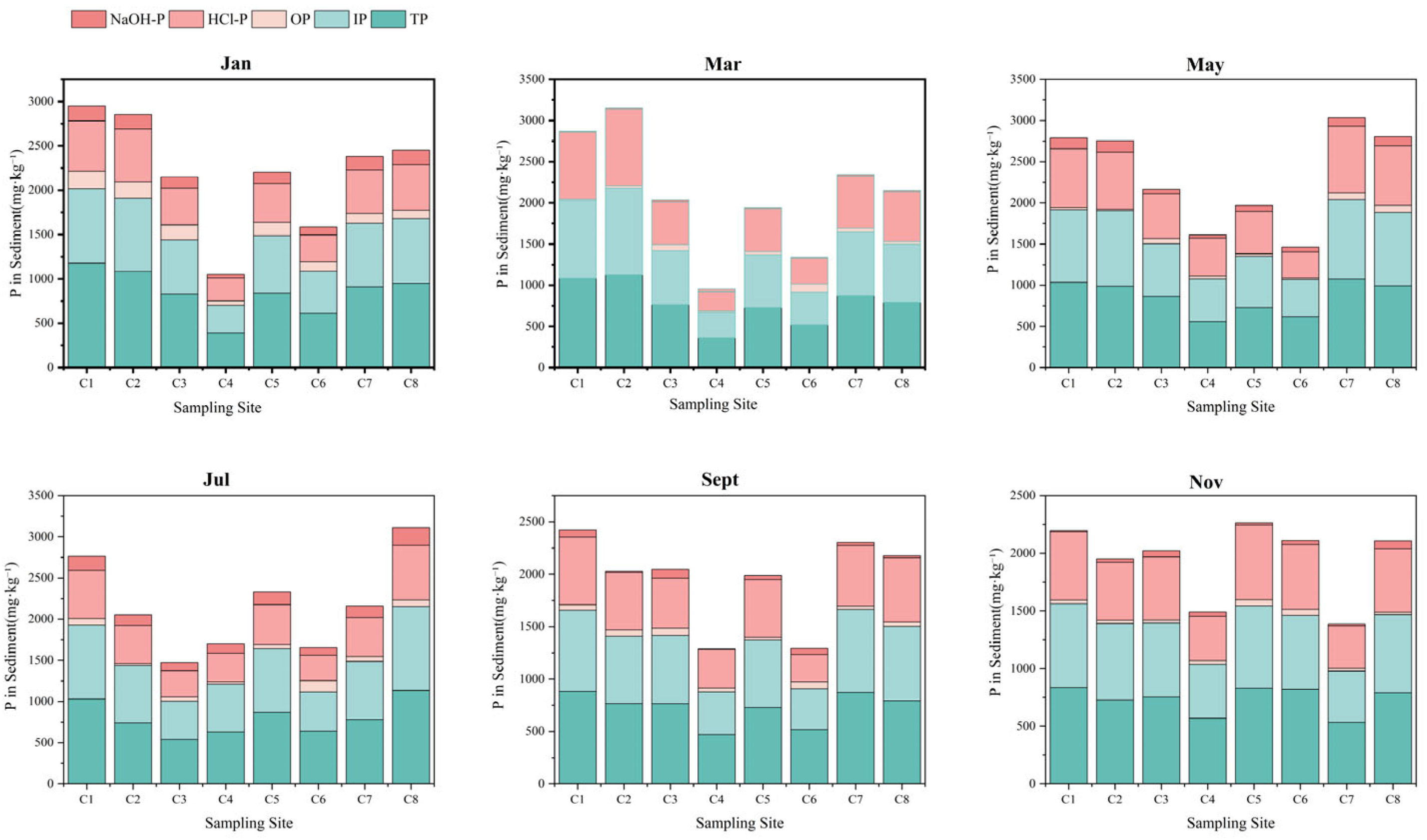 3.1. Spatiotemporal Distribution of Sediment Phosphorus