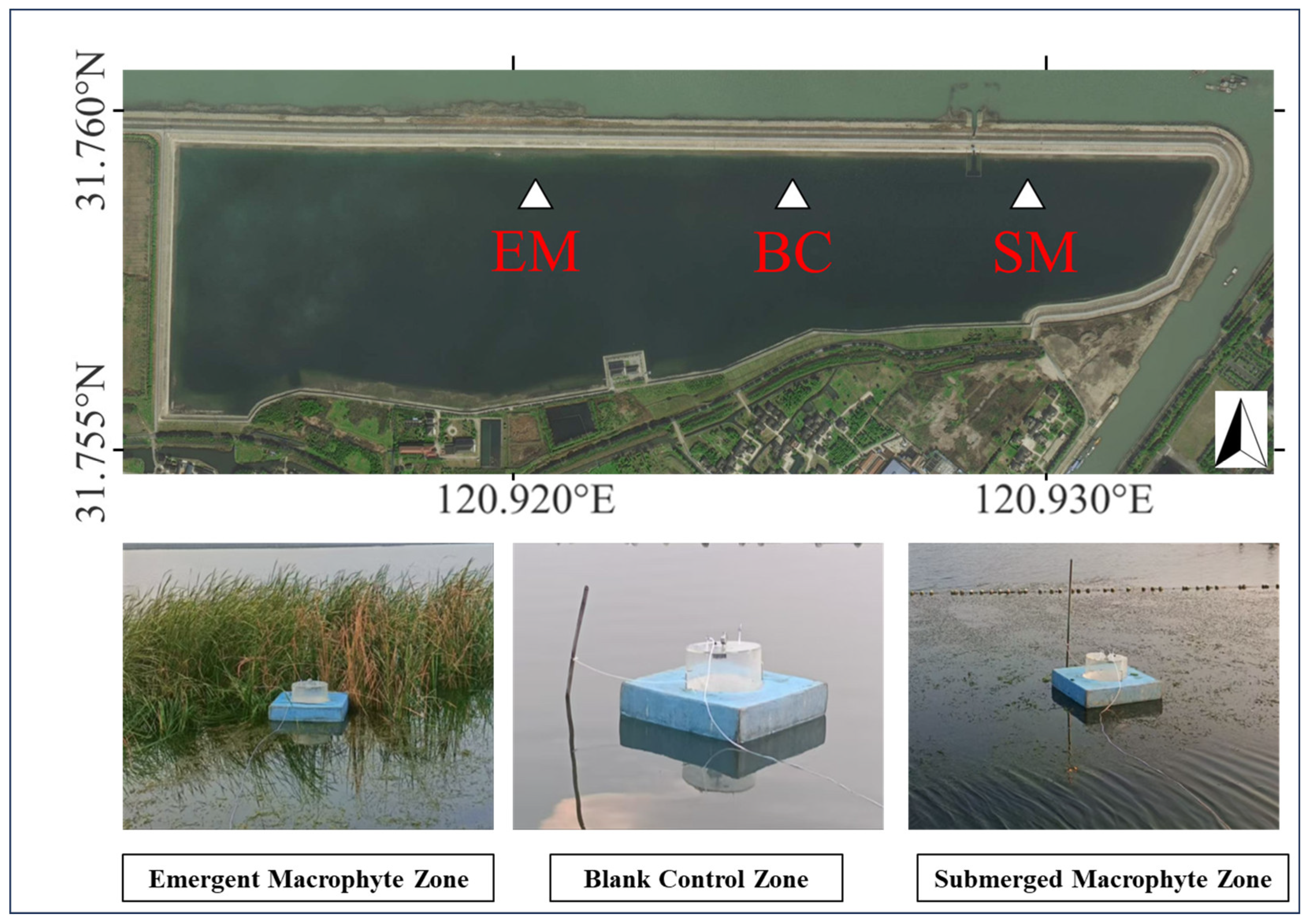 - Diao, F.; Qian, T.; Qiu, W.J.; Anwaier, A.; Guan, B.H.; Huang, X.L.; Xing, P.; Wu, Q.L.; Su, Y.L.; Li, K.Y. Role of submerged macrophytes with different growth forms in CO2 and CH4 emissions: Insights from a year-long mesocosm study. J. Plant Ecol. 2025, rtaf201. [Google Scholar] [CrossRef]