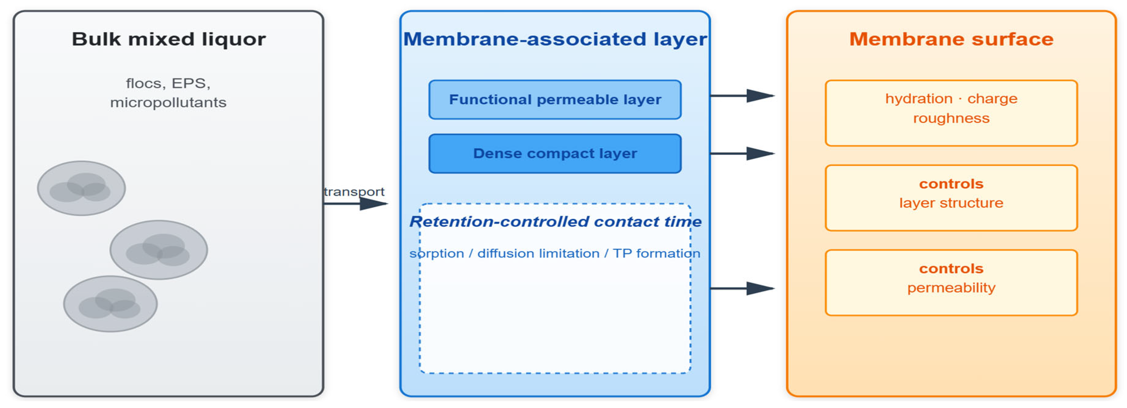 - Optimal charge window, not maximum charge. Near-neutral ζ-potentials (−15 to +5 mV) minimize divalent-cation-mediated EPS bridging and gel compaction compared to strongly charged surfaces. ζ-potential values in the range of −15 to +5 mV repeatedly correlate with higher fractions of reversible fouling and slower cake consolidation, whereas strongly cationic surfaces (ζ +20 to +25 mV) promote rapid gel compaction under elevated ionic strength conditions typical of municipal wastewater [4,14]. Limiting electrostatic extremes is critical for maintaining permeable fouling layers.