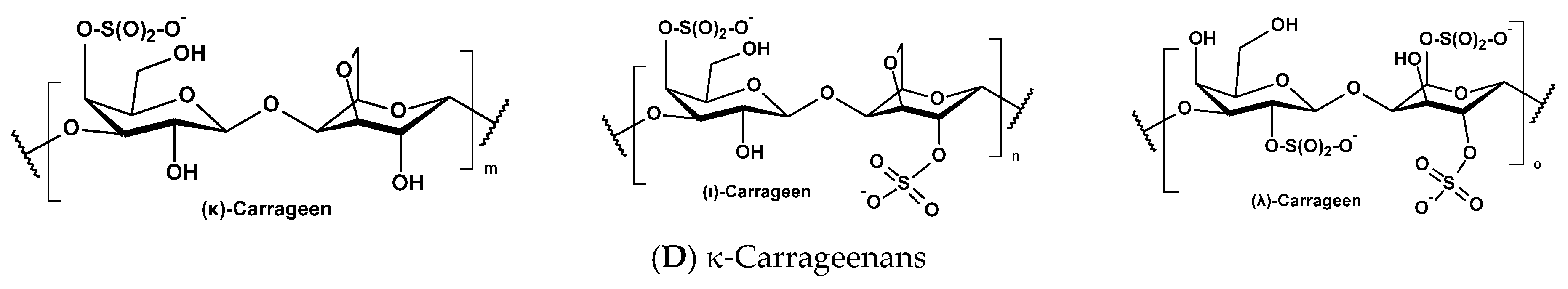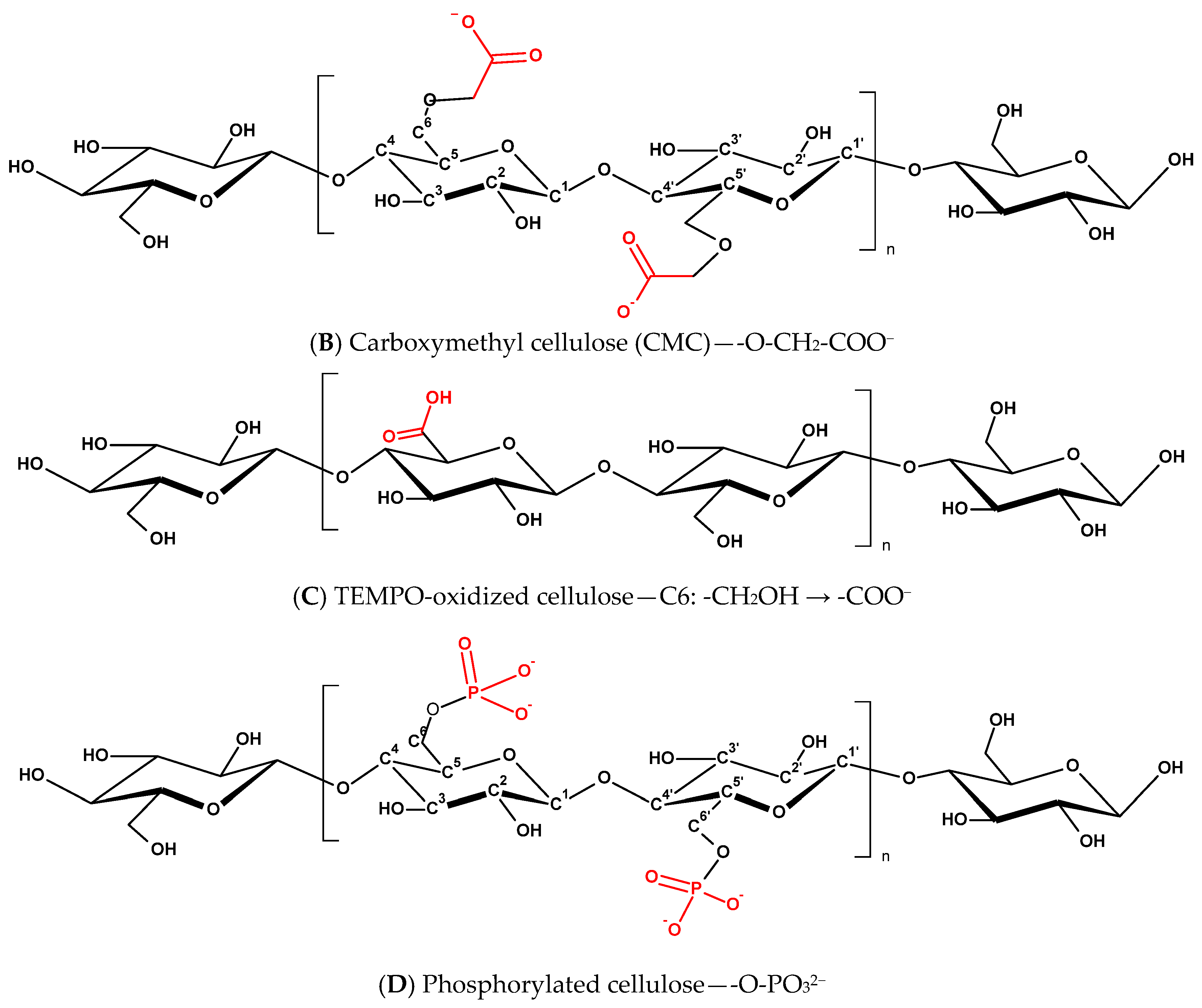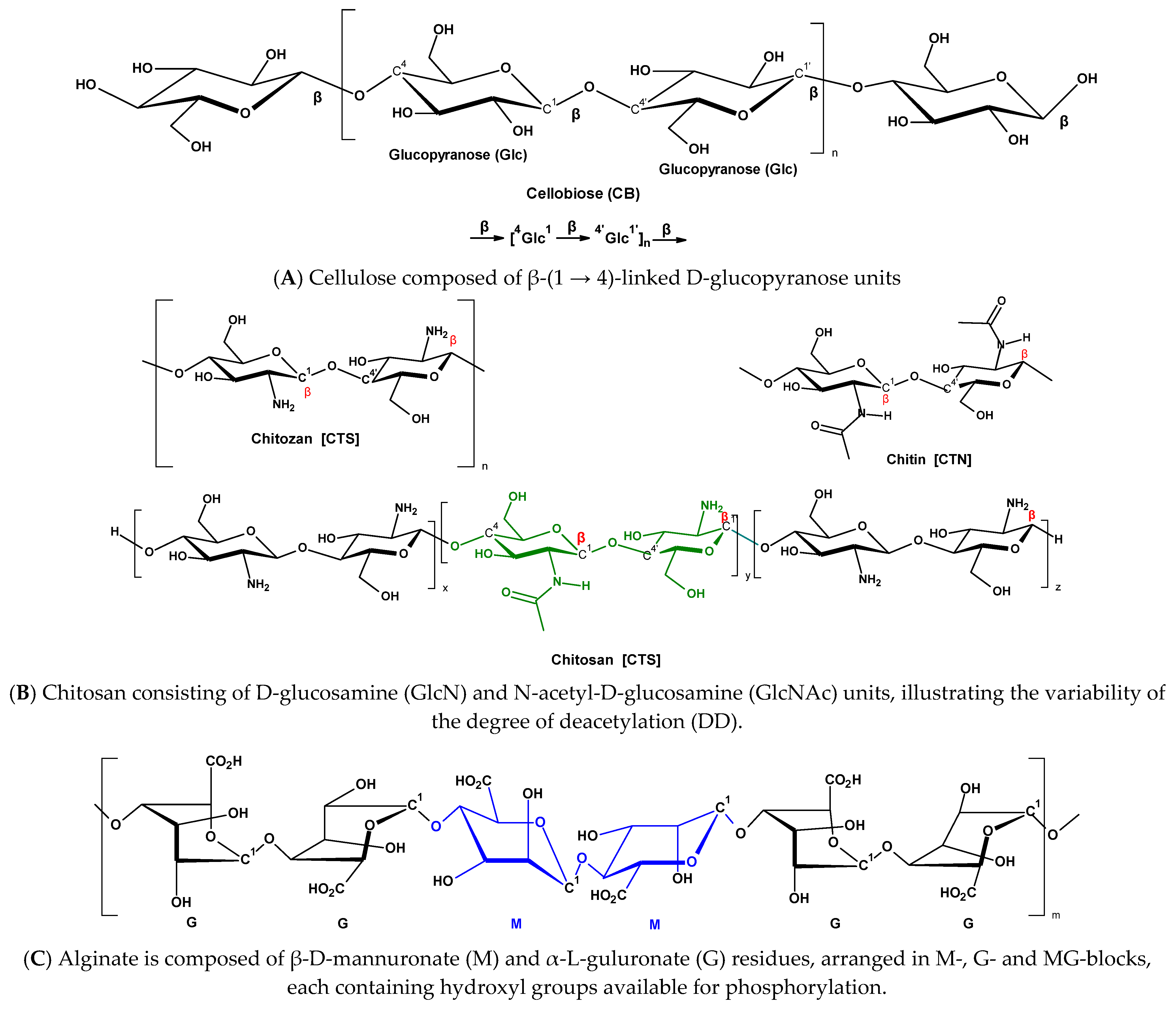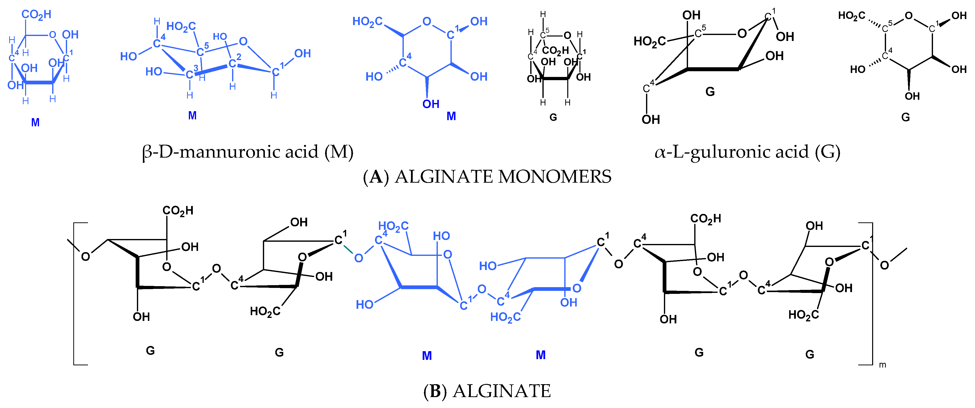 | Chemical structure | Linear β-1,4-glucan; mainly –OH groups | Linear β-1,4-glucosamine; partially deacetylated | Guluronate/mannuronate blocks; –COO− groups | [8,9,12,41] |