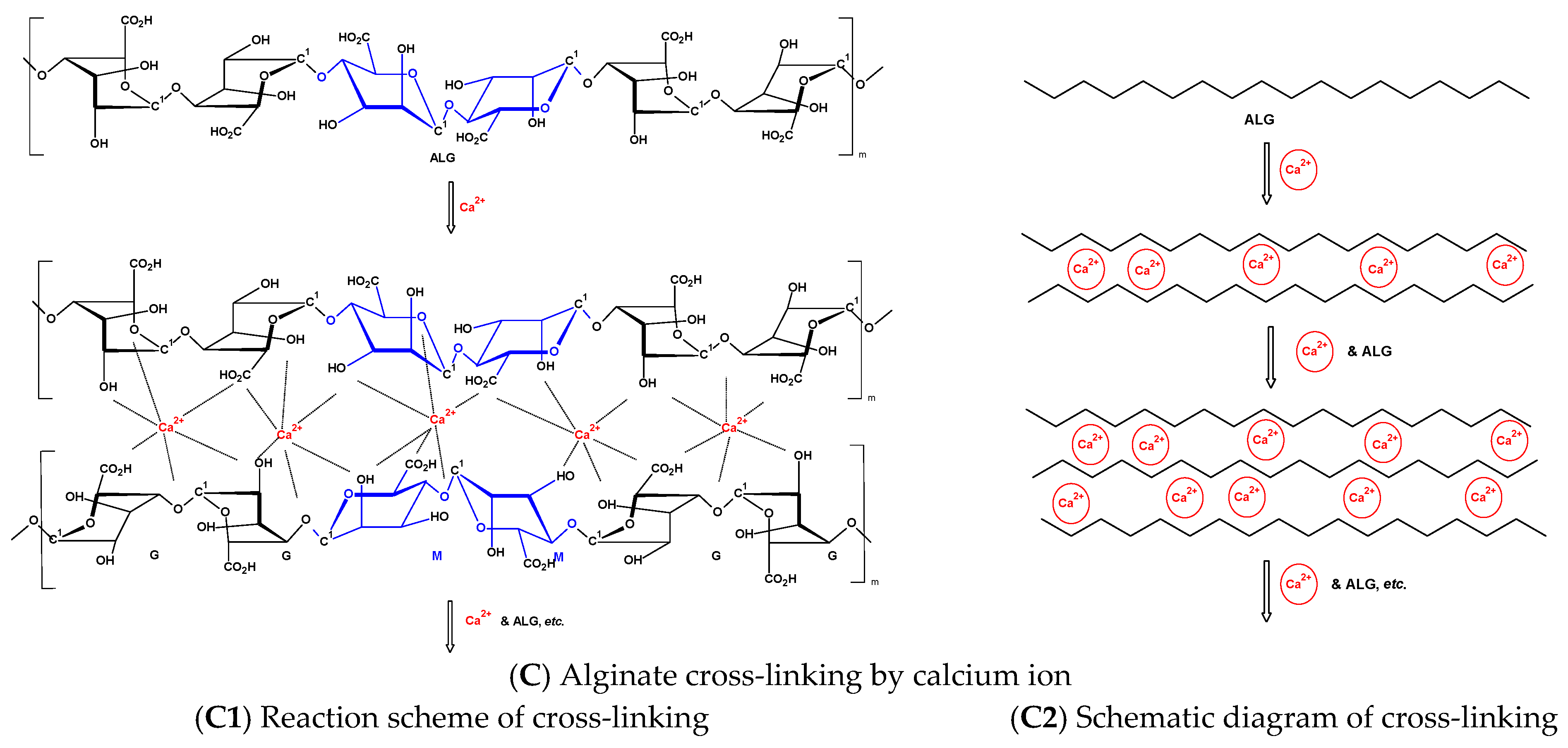 | Cross-linking strategies | Citric acid, genipin | Genipin, glutaraldehyde, citric acid (usually required) | Ca2+ (ionic); adipic dihydrazide (covalent) | [12,13,14,15,40] |