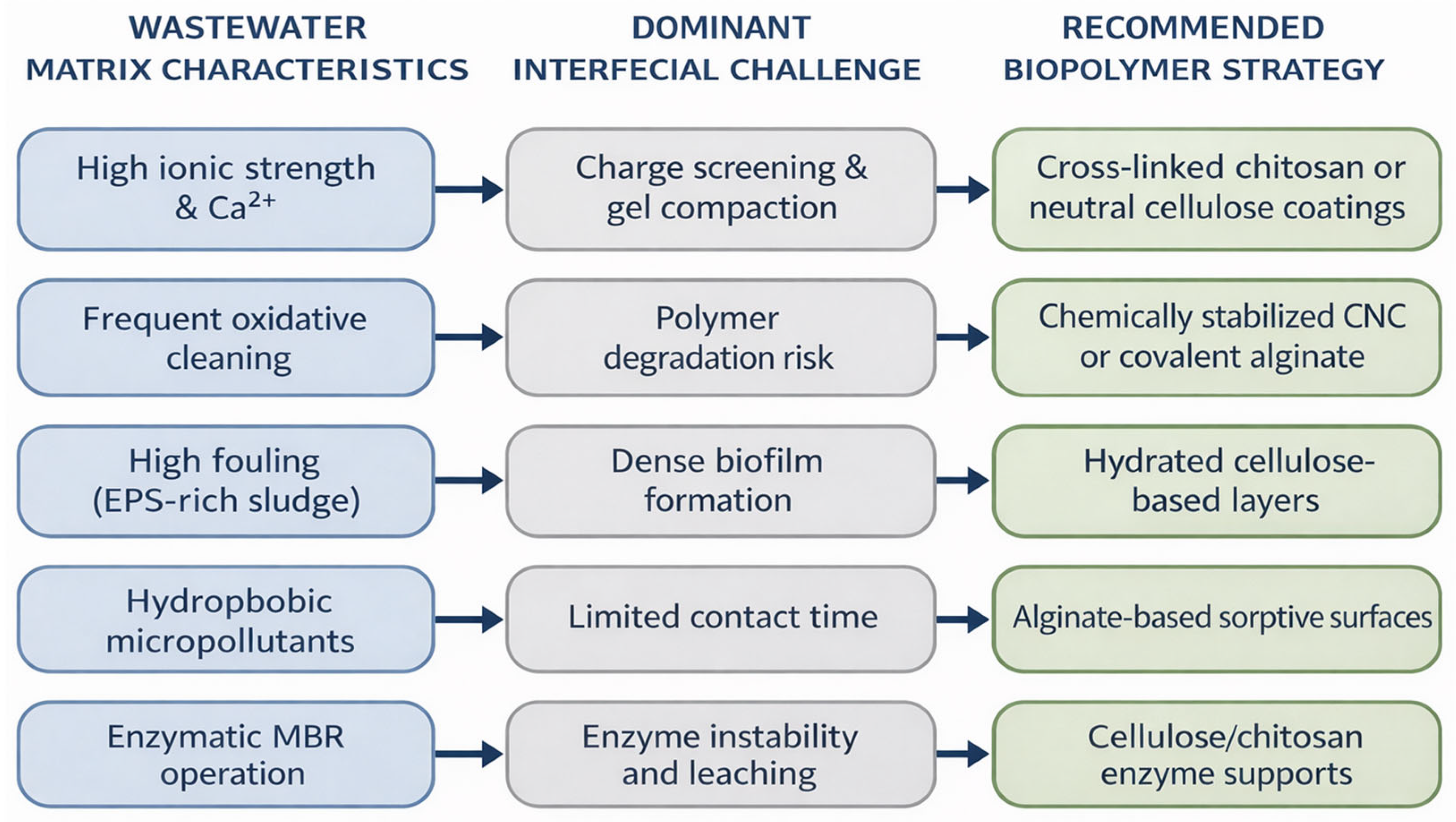 - Building on the performance windows summarized in Table 4, a practical selection guideline is proposed to assist in choosing biopolymer surface modifications based on wastewater matrix characteristics and dominant operational constraints (Figure 6). The framework translates interfacial design principles into an intuitive decision pathway linking wastewater chemistry with suitable polymer strategies.