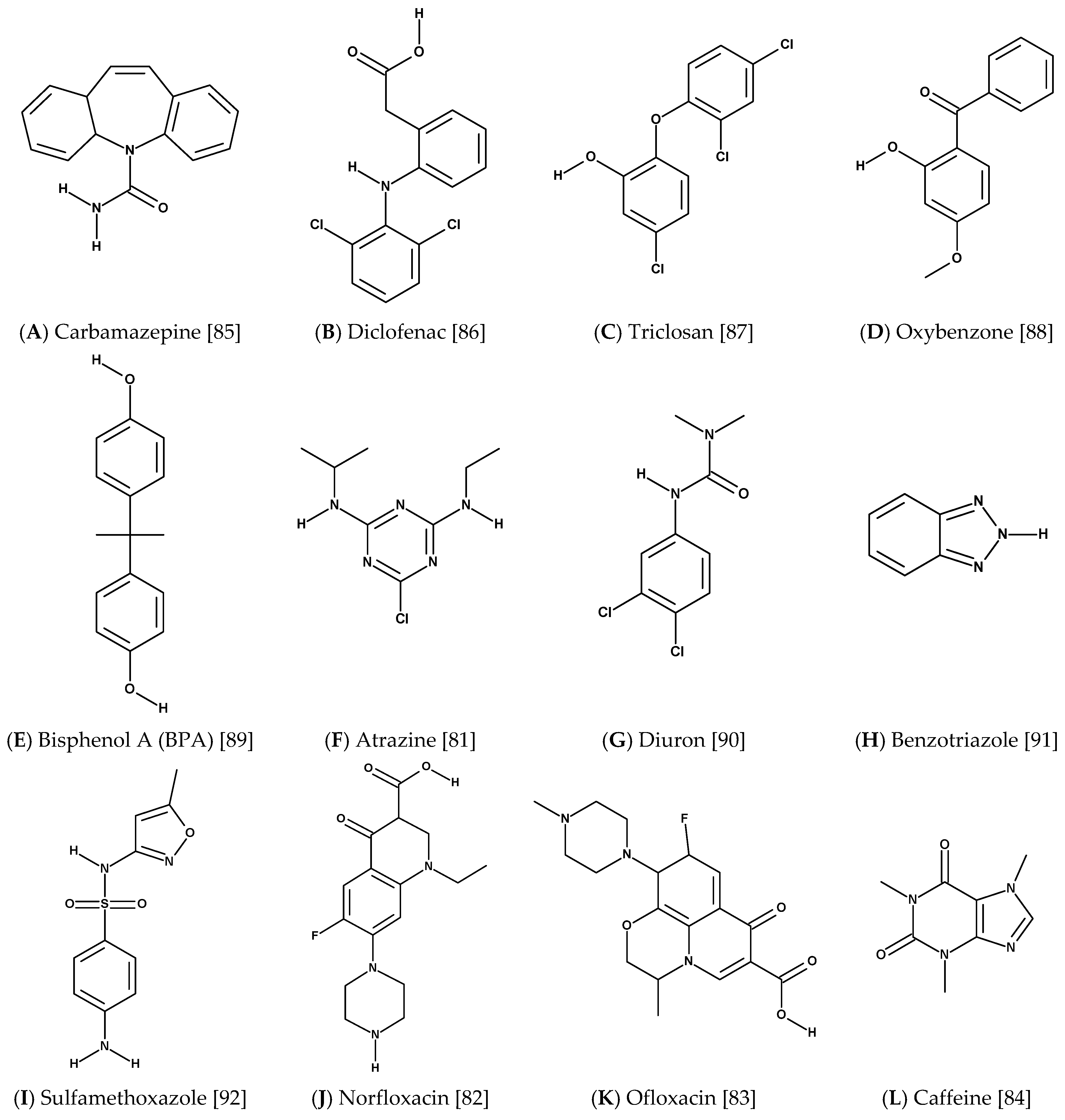 | Industrial/ household chemicals | Benzotriazoles, phenolic additives | Poor removal of polar species | Near-neutral charge; hydrogen bonding | [7,24] |