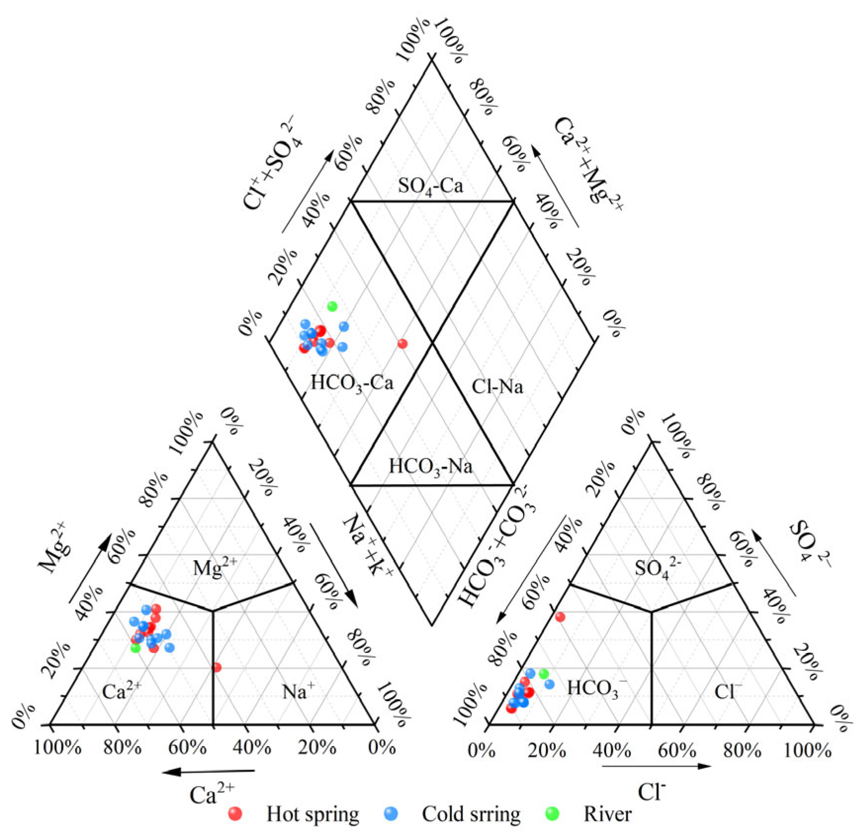 Most spring points exhibit concentrations and temperatures that exceed medical thresholds for free carbon dioxide levels and total dissolved solids (TDSs), further confirming their classification as low-temperature weakly acidic geothermal water. These characteristics suggest significant potential for therapeutic applications, making these springs a valuable resource for both scientific study and potential utilization in the health and wellness industry. Moreover, the hydrogeochemical compositions of surface water and groundwater (spring water) in the study area are detailed in Table 2, providing a comprehensive understanding of the region’s hydrological dynamics. This data is essential for further research and sustainable management of these geothermal resources.