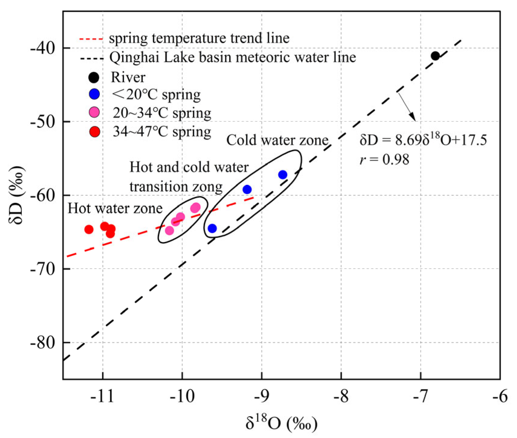 To comprehensively obtain environmental isotope information for cold springs and geothermal waters in the study area, an analysis of stable hydrogen and oxygen isotopes in cold spring water, geothermal water, and river water was conducted. These values were then compared with the local meteoric water line (LMWL) of the Qinghai Lake Basin, which is defined by the equation δD = 8.69δ18O + 17.5 [28].