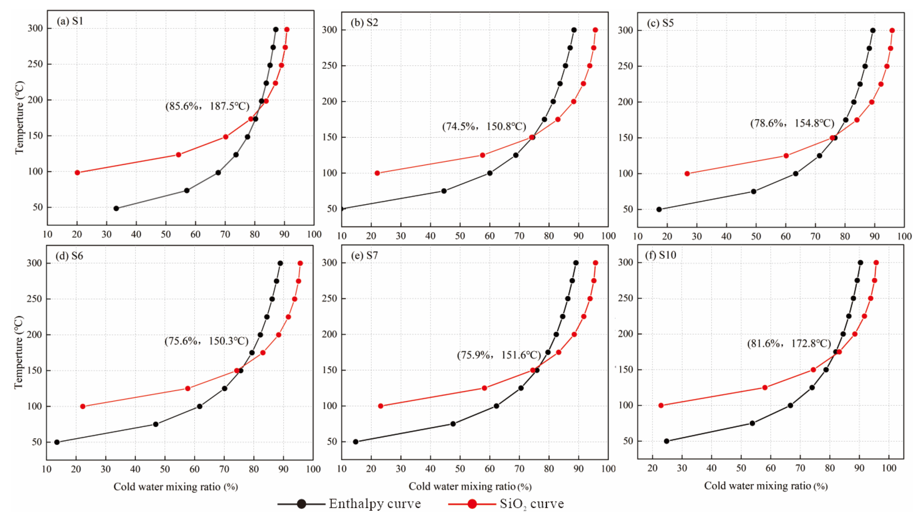 where X is the cold-water mixing ratio; Hc, Hh, and Hs are the enthalpy of surface cold water, the enthalpy of deep geothermal water, and the enthalpy of hot-spring water; and Sic, Sih, and Sis are the SiO2 content of surface cold water, the SiO2 content of deep geothermal water, and the SiO2 content of hot-spring water, respectively. For temperatures above 100 °C, the relationship between temperature and the enthalpy of saturated water can be found in Table 1 [21].