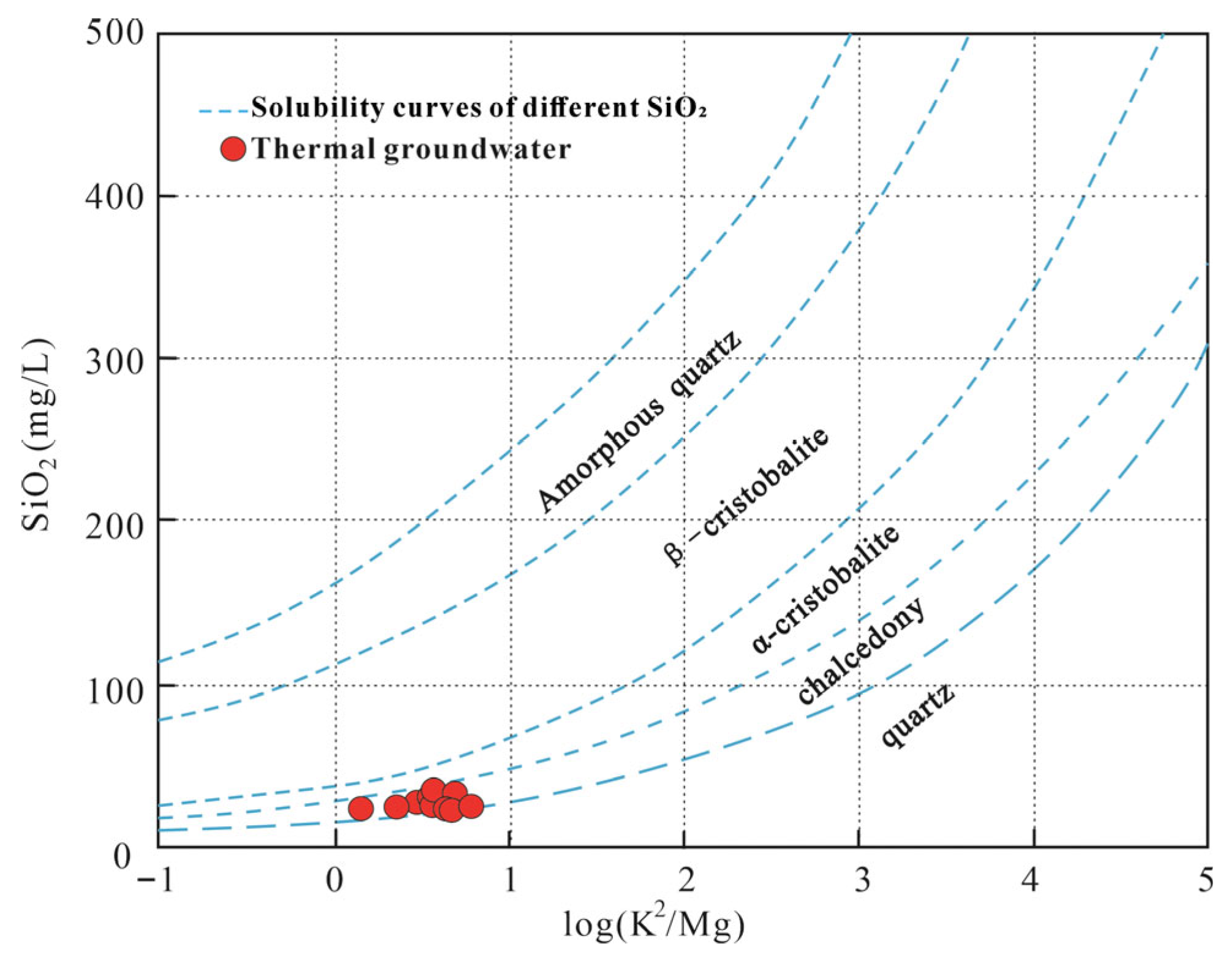 The relationship diagram correlating SiO2 and log(K2/Mg) was utilized to evaluate the dissolution behavior of various SiO2-containing minerals [35]. As shown in Figure 6, the hot-water samples in this study area are positioned between the chalcedony and quartz curves, indicating that the SiO2 in hot water primarily results from the dissolution of quartz and chalcedony. Therefore, when calculating the heat storage temperature in this region, it is more appropriate to use the temperature scale derived from quartz and chalcedony.