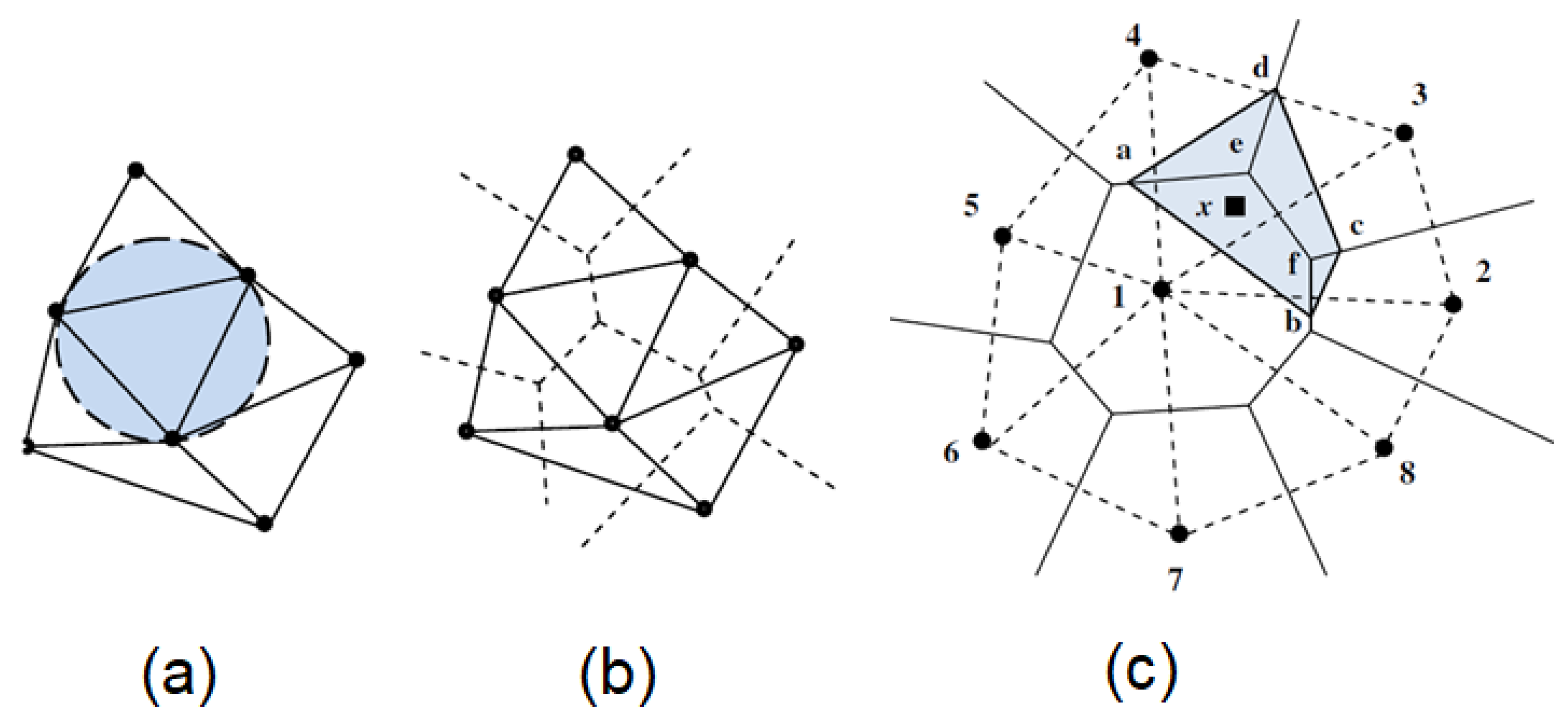 Figure 1a presents the circumcircle criteria diagram. The first-order Voronoi diagram of the set N is a subdivision of the space into Voronoi cells, as in