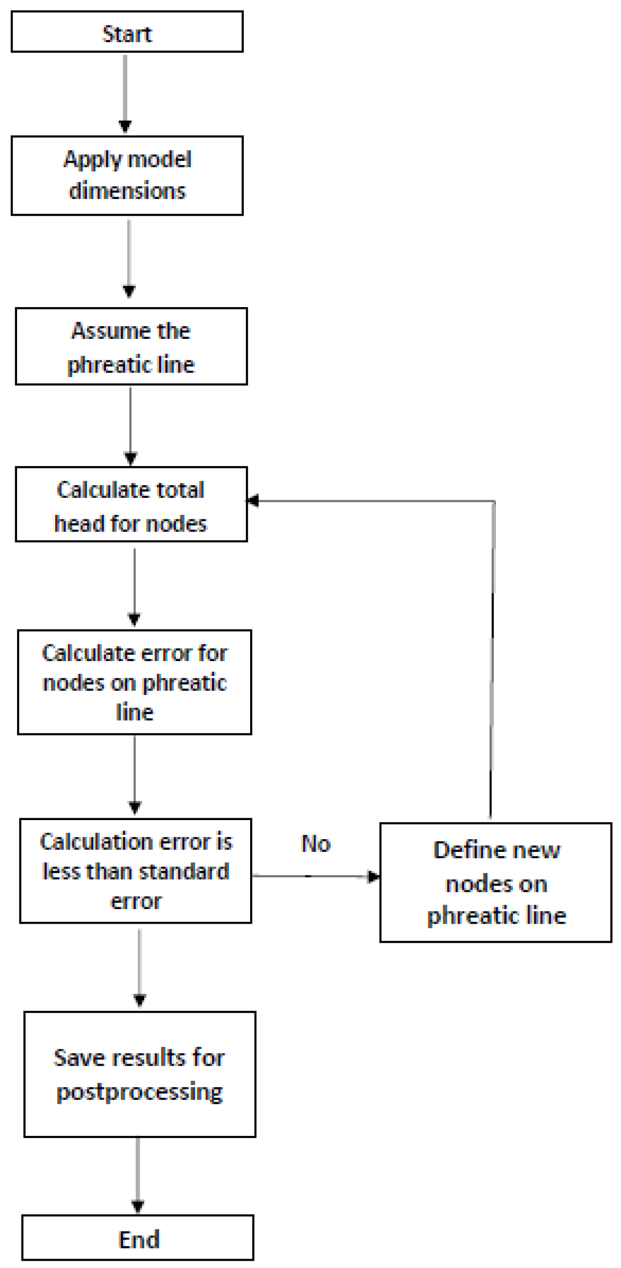 Figure 4 shows the schematic flowchart used in the modeling technique. To calculate the phreatic line, first, an estimation is made by applying specific boundary conditions at the considered nodes. Then a first iteration of the analysis is applied and the total head values computed. Afterwards, with a modified phreatic line, the analysis is repeated. The position of the phreatic line is acceptable if the difference between the total heads of two iterations is less than a tolerance value. The iterative process continues until stability is reached.