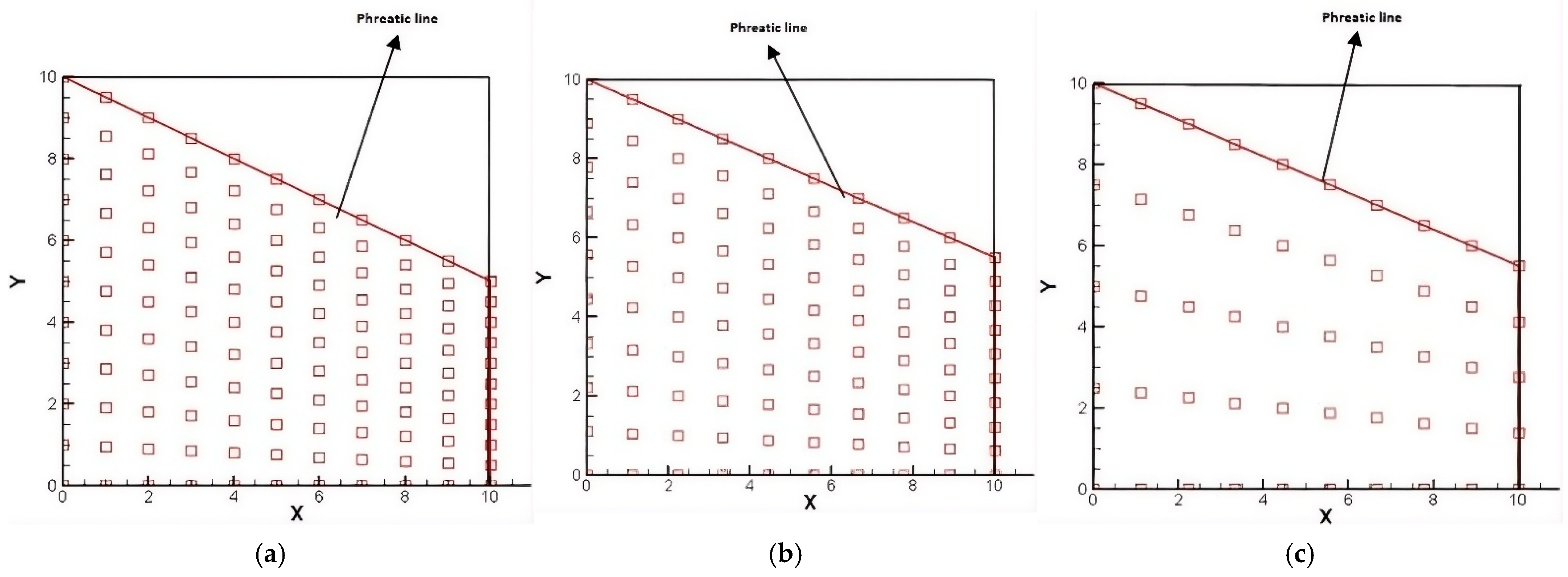 Figure 11, both surfaces’ results for phreatic line and saturation rate match well with the results from the paper’s method; the details of the accuracy can be seen in
