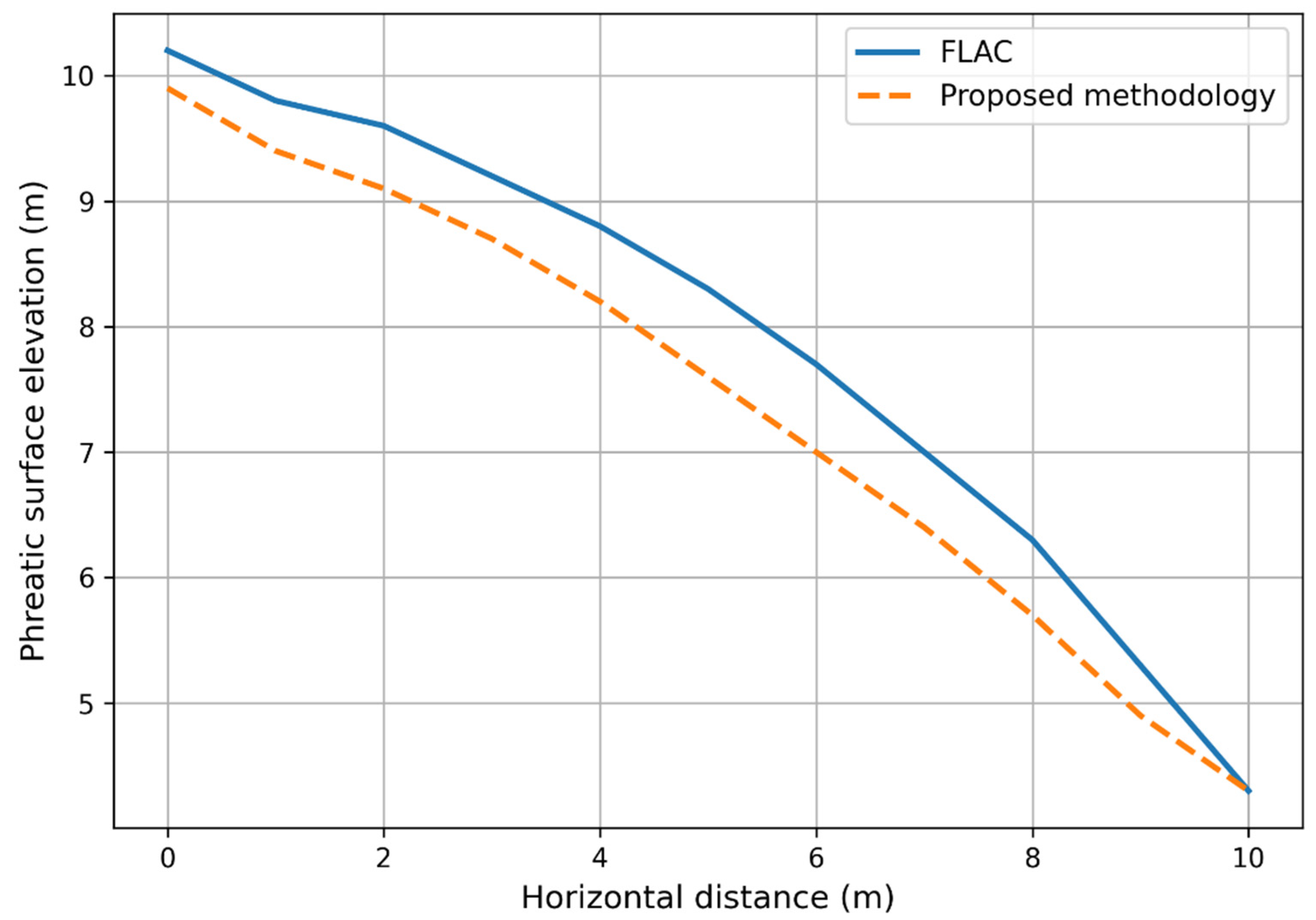 The phreatic surface gained from the natural element method was modeled in FLAC2D software version 9.1 to be compared with the NEM solution. A single hydraulic conductivity value was used and kept identical in both the NEM and FLAC2D; no parameter tuning was introduced specifically to improve agreement. The FLAC2D model used the same 2D cross-section geometry as the NEM setup, with identical hydraulic boundary conditions (upstream total head, downstream seepage face, and impermeable base) and the same homogeneous hydraulic conductivity and unit weight parameters. A structured quadrilateral grid with an average element size comparable to the NEM node spacing was adopted, and a steady-state seepage analysis was performed using FLAC2D’s default iterative solver with convergence tolerance matching the NEM 0.01 m criterion. The FLAC model is developed, and the hydraulic boundary condition of the model is adjusted to satisfy