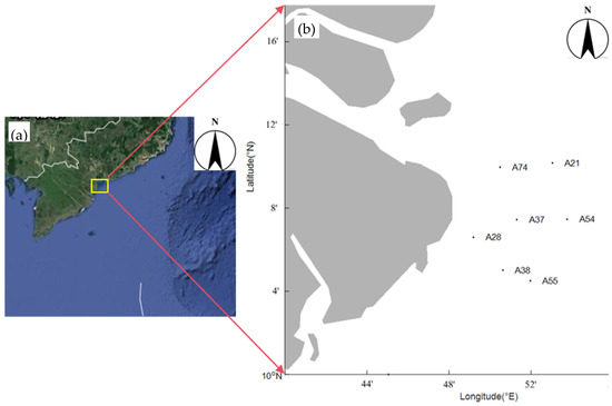 (a) Geographical location of the study area (eastern outer Mekong River Estuary, Vietnam; 105.5° E–106.5° E, 8.5° N–9.5° N); (b) spatial distribution of seven representative observation stations (A21, A74, A37, A54, A28, A38, A55) covering different water depth gradients (3.15–7.18 m).