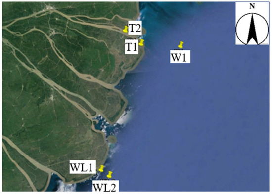 Location of tide gauge stations (T1, T2, W1, WL1, WL2) used for water level validation.