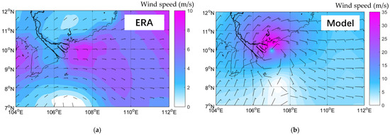Wind field of Typhoon Durian (00:00 UTC, 5 December 2006). (a) ERA-Interim reanalysis wind field [37]; (b) WRF-simulated wind field.