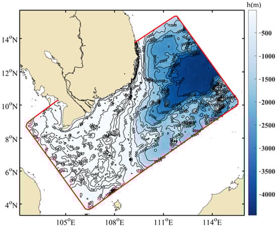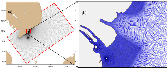 Open-boundary tidal forcing was derived from the Tide Model Driver (TMD) global tidal model, incorporating 11 major tidal constituents (M2, S2, N2, K2, K1, O1, P1, Q1, M4, M6, MS4) [31]. Widely validated in the South China Sea and Mekong River estuary [5,6], TMD exhibits superior performance in reproducing tropical coastal tidal propagation and amplitude.