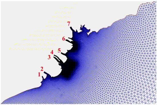 Classified as a mesotidal environment (mean tidal range: 2.5 ± 0.1 m; maximum: 3.2–3.8 m), the estuary’s east–west orientation constrains tidal currents to a reciprocating pattern [27,28]. Human disturbances (upstream reservoirs, nearshore sand mining) alter inner delta sediment supply but exert negligible effects on the outer estuary, where tides and monsoons dominate [5,29]. Seven representative stations (Figure 1) were selected to cover the full depth and topographic gradient, enabling quantification of hydrodynamic spatial heterogeneity—an essential requirement for capturing coastal zone complexity.