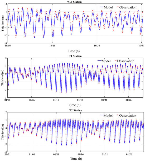 Water level validation at station WL1, station T1 and station T2 (January–March 2020). Blue lines represent FVCOM simulations, and red stars represent in situ observations (1 h interval).