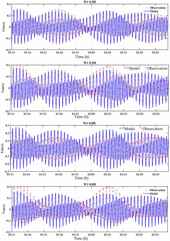 Tidal current validation at station W1. Blue lines represent FVCOM simulations, and red stars represent in situ observations (1 h interval).