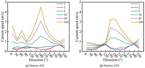 Extreme current velocities for return periods of 1–100. (a) Station A21; (b) Station A54.