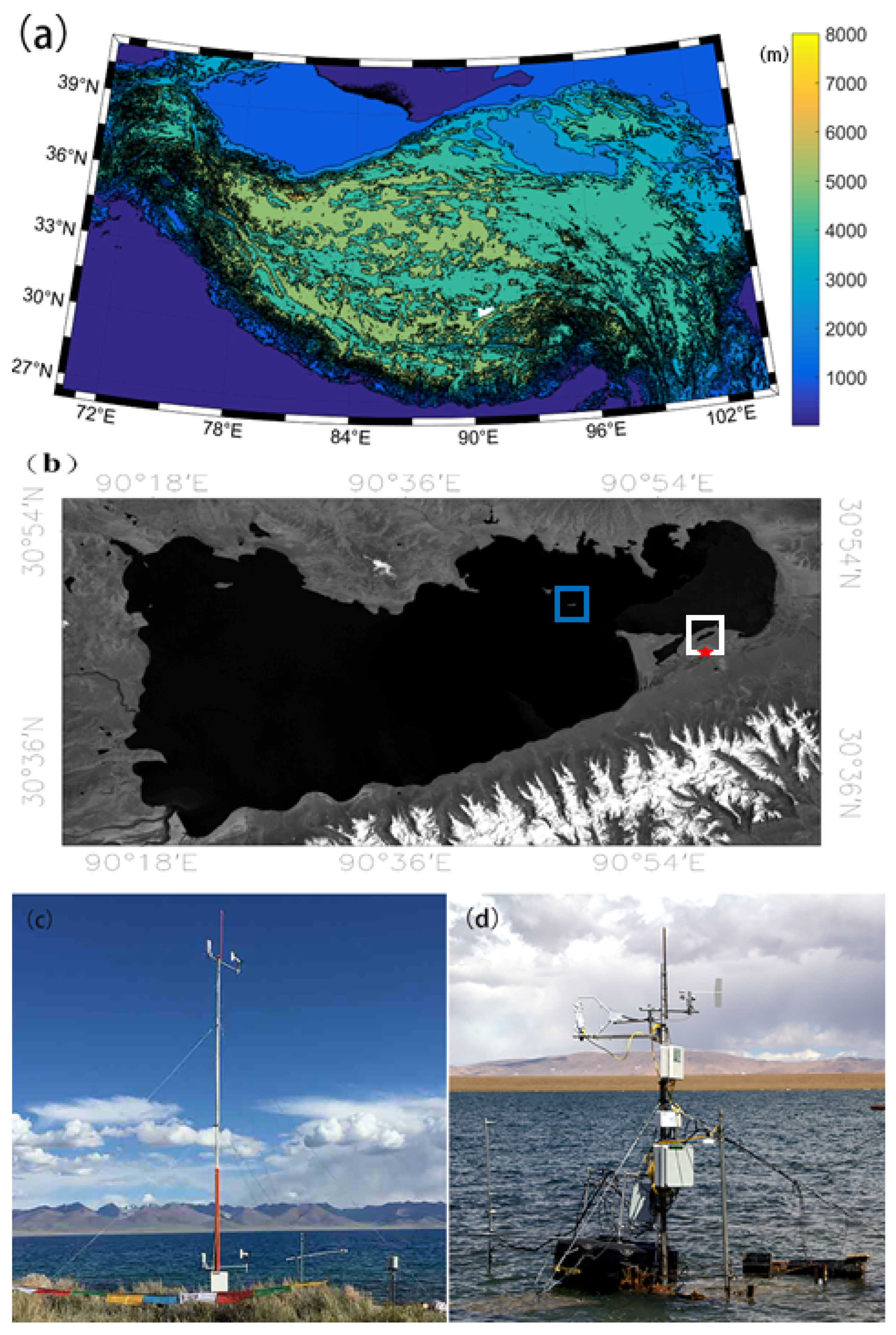 - Wang, B. Observation and Modeling of Vertical Heat Exchange of Lakes in Namco Basin, Tibetan Plateau. Ph.D. Thesis, University of Twente, Faculty of Geo-Information Science and Earth Observation (ITC), Enschede, The Nederlands, 2019. [Google Scholar] [CrossRef]