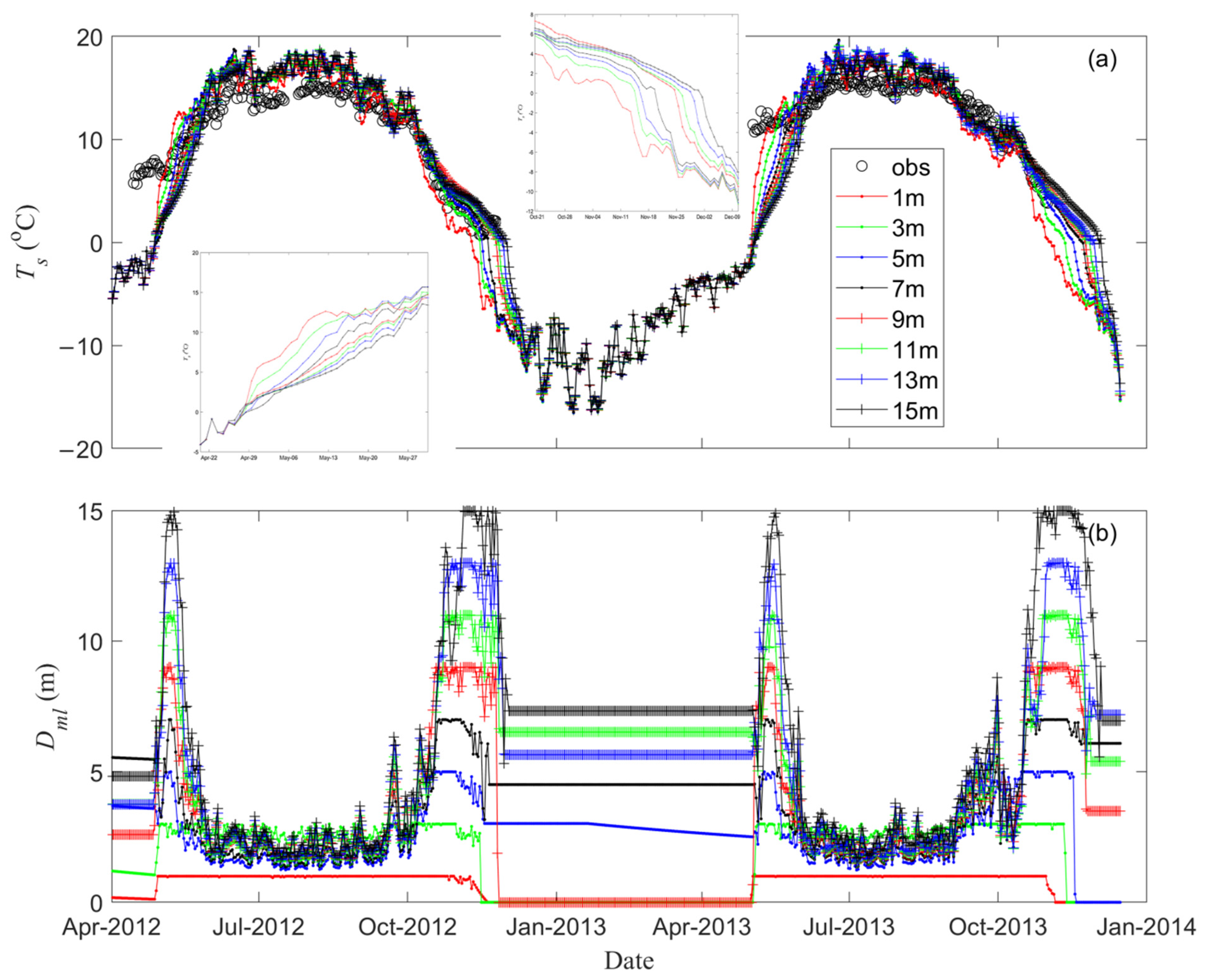 - Huang, L.; Wang, J.; Zhu, L.; Ju, J.; Daut, G. The Warming of Large Lakes on the Tibetan Plateau: Evidence from a Lake Model Simulation of Nam Co, China, During 1979–2012. J. Geophys. Res. Atmos. 2017, 122, 13095–13107. [Google Scholar] [CrossRef]