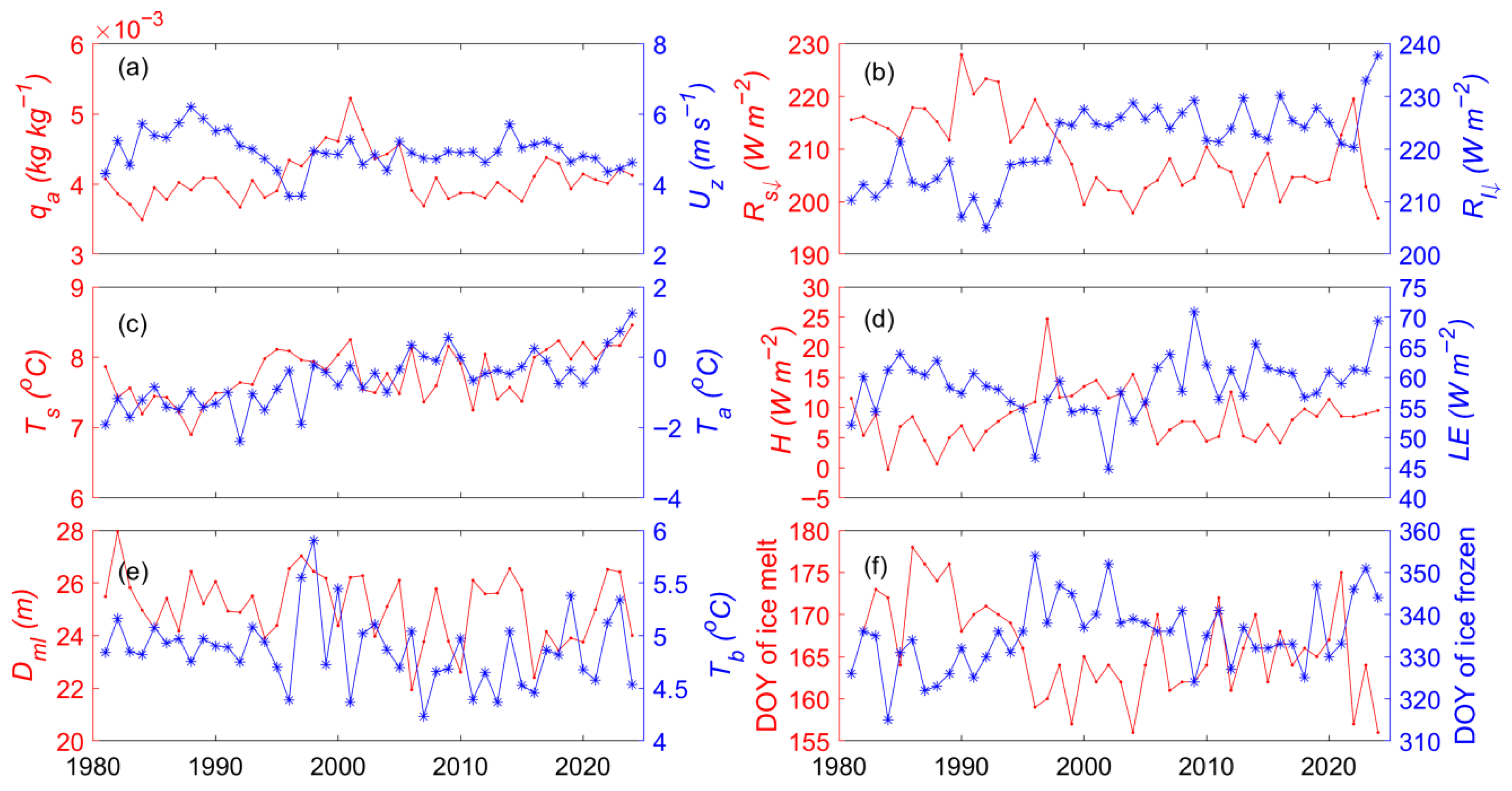 - Wu, Y.; Huang, A.; Li, X.; Wen, L.; Li, J. Thermal Response of Large Seasonally Ice-Covered Lakes Over Tibetan Plateau to Climate Change. J. Geophys. Res. Atmos. 2024, 129, e2023JD039935. [Google Scholar] [CrossRef]