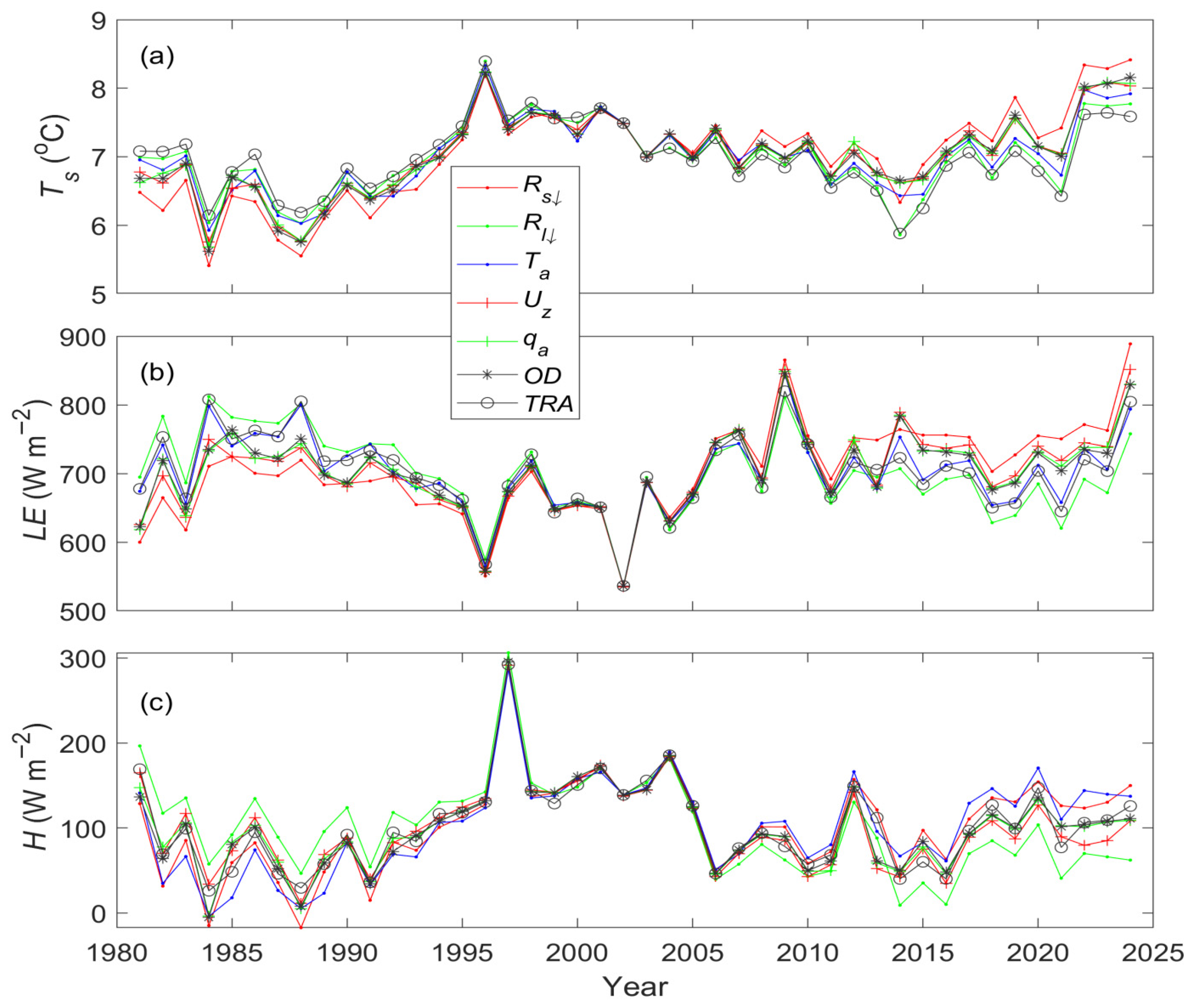 - Wei, Y.; Zhang, X.; Li, W.; Hou, N.; Zhang, W.; Xu, J.; Feng, C.; Jia, K.; Yao, Y.; Cheng, J.; et al. Trends and variability of atmospheric downward longwave radiation over China from 1958 to 2015. Earth Space Sci. 2021, 8, e2020EA001370. [Google Scholar] [CrossRef]