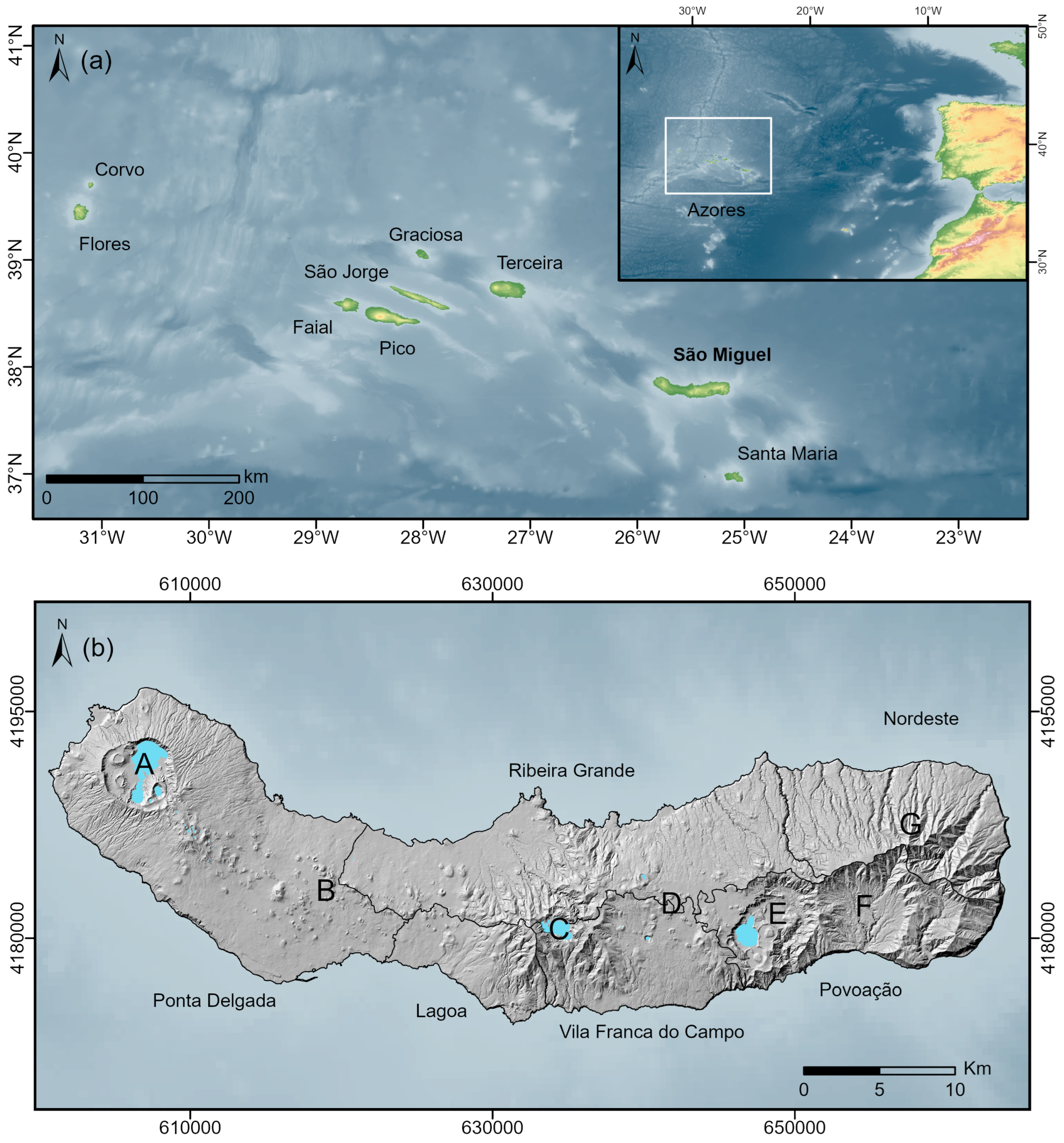 - Queiroz, G.; Gaspar, J.L.; Guest, J.E.; Gomes, A.; Almeida, M.H. Eruptive history and evolution of Sete Cidades volcano. In Volcanic Geology of São Miguel Island (Azores Archipelago); Geological Society, London, Memoirs: London, UK, 2015; Volume 44, pp. 87–104. [Google Scholar] [CrossRef]
