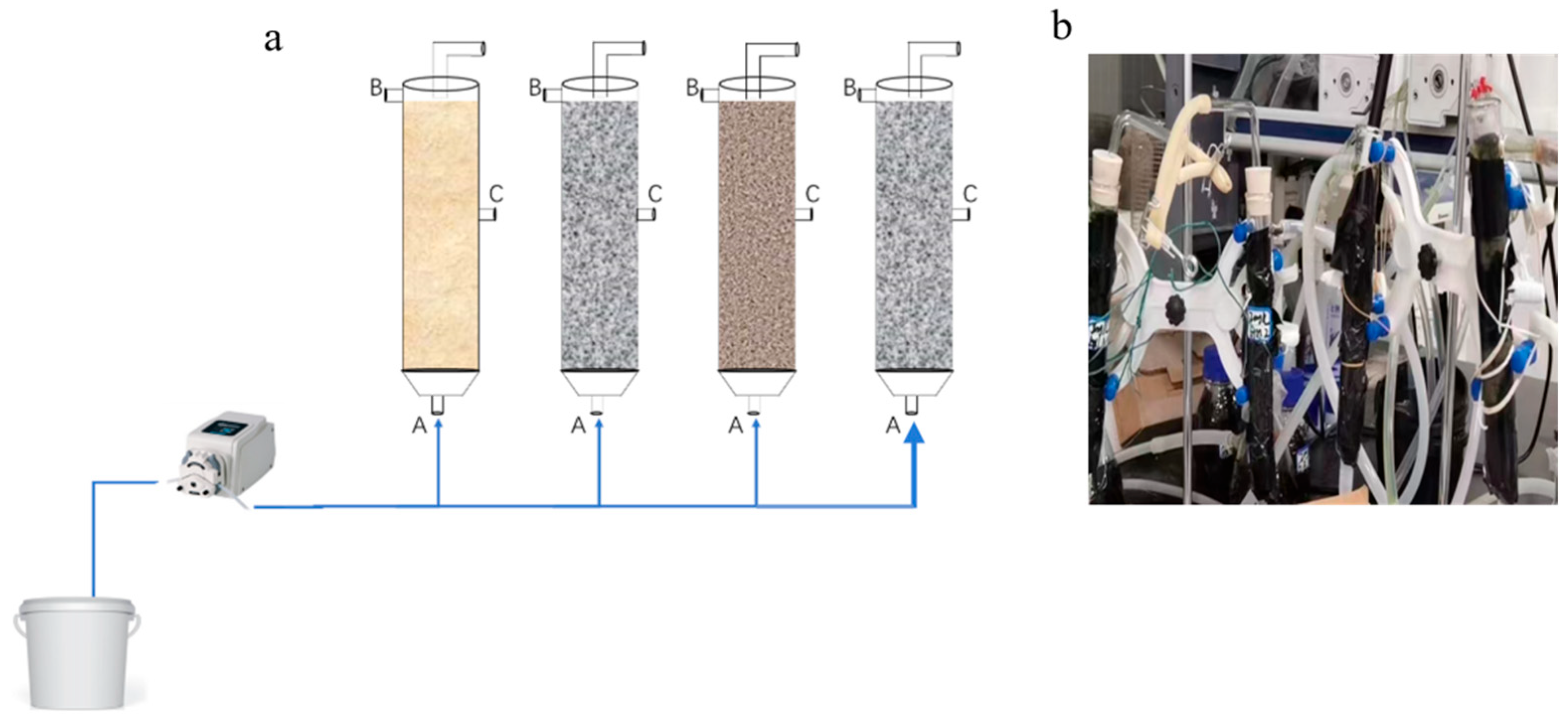 - Li, Q.; Gao, J.; Zhang, J.; Huang, Z.; Wang, S.; Song, B.; Wang, Q.; Zhou, W. Treatment of High-Phosphorus Load Wastewater by Column Packed with Non-Burning Compound Filler/Gravel/Ceramsite: Evaluation of Performance and Microorganism Community. Environ. Sci. Pollut. Res. 2023, 30, 67730–67741. [Google Scholar] [CrossRef]