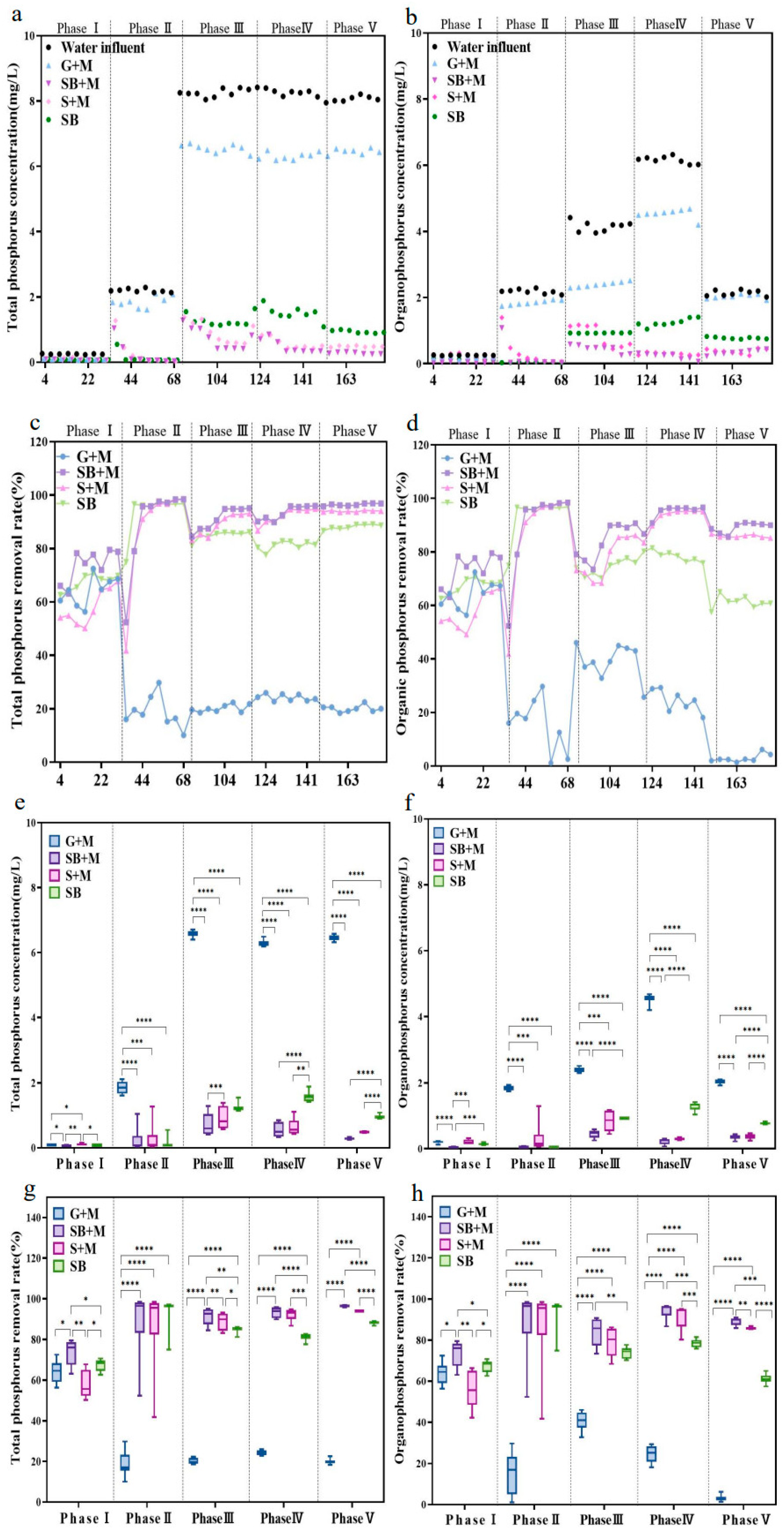 | Phase | Time (Days) | G + M (mg/L) | SB + M (mg/L) | S + M (mg/L) | SB (mg/L) |