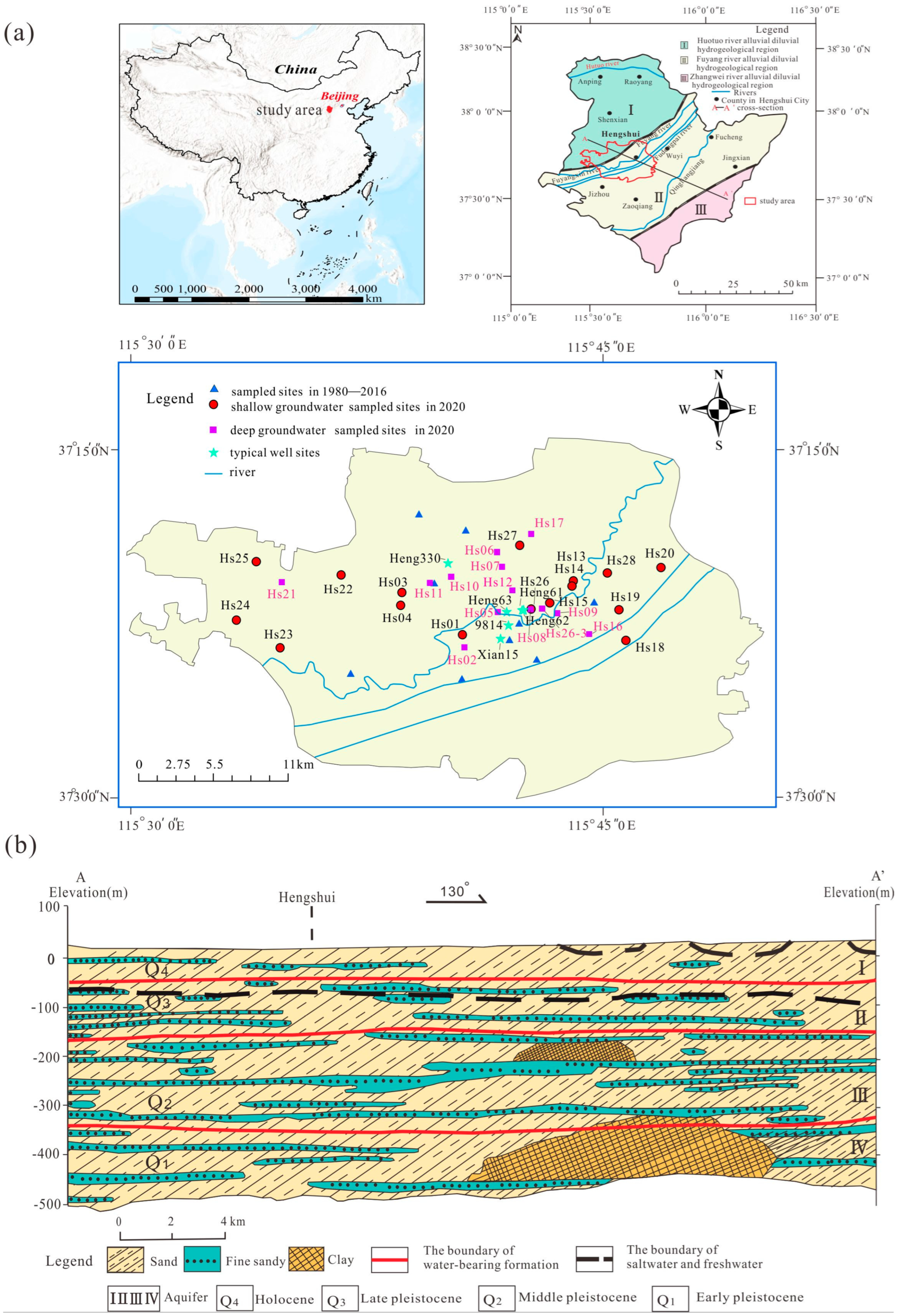 Hengshui can be divided into three main hydrogeological zones: Zone I is the Hutuo River and is alluvial–diluvial, Zone II is the Fuyang River and is alluvial–diluvial, and Zone III is the Zhangwei River and is alluvial–diluvial (Figure 1a). The groundwater in the study area is unconsolidated pore water. The Quaternary aquifer can be divided from top to bottom into four aquifers: I, II, III, and IV (Figure 1b), which correspond to the Holocene (Q4), Upper Pleistocene (Q3), Middle Pleistocene (Q2), and Lower Pleistocene (Q1) strata, respectively [27]. Aquifer I is a phreatic to weakly confined aquifer, with a bottom of 60 m. It consists of medium- to fine-grained sand in fluvial facies, with a mixed distribution of fresh and saline water [28]. Aquifer II is a confined aquifer with a bottom of 170 m. It comprises loose muddy and sandy sediments in fluvial–alluvial facies and is predominantly a saline-water aquifer in most areas. Aquifer III and IV, with a bottom of 350 m and 550 m, respectively, are composed mainly of medium to fine sands in fluvial–lacustrine facies.