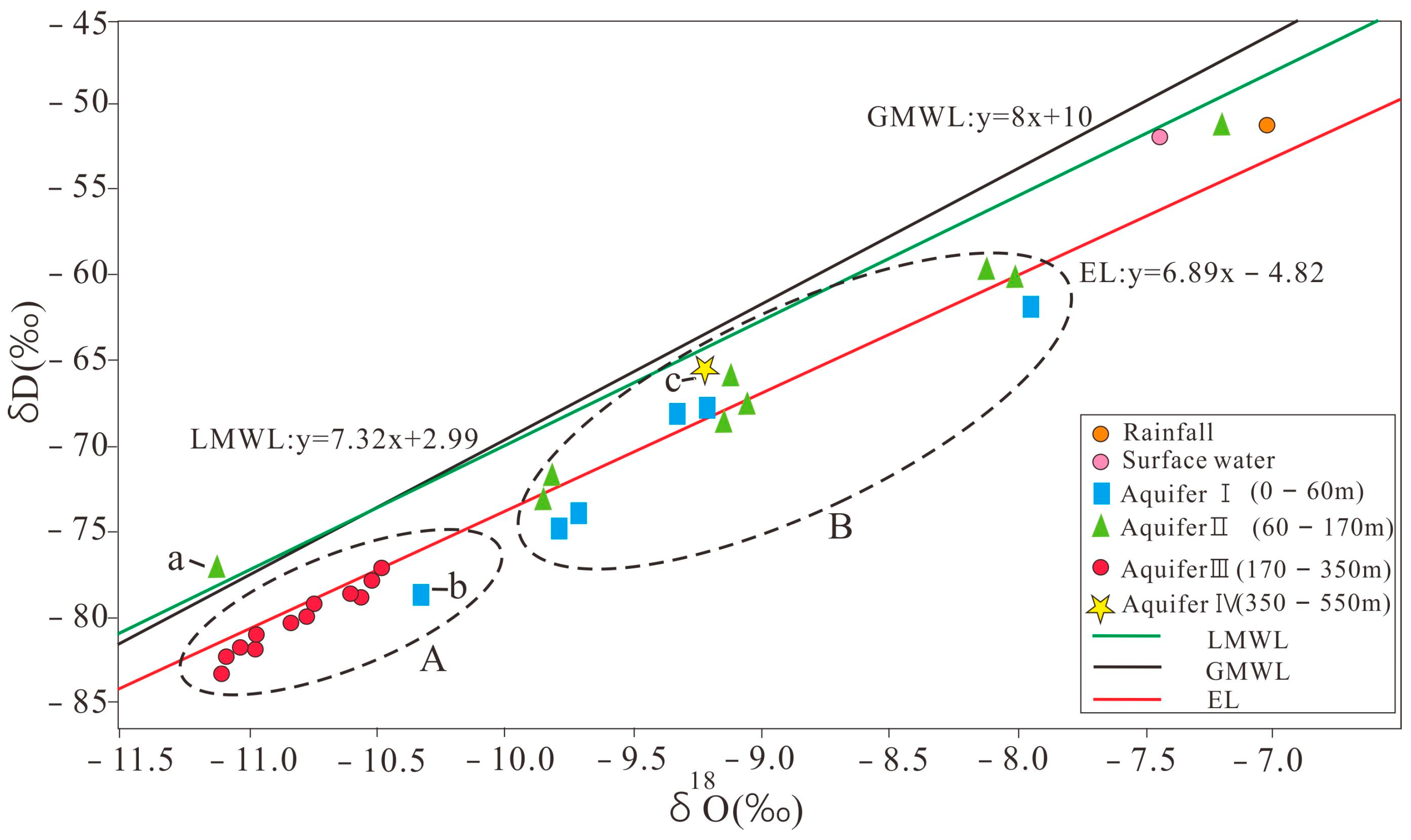 For Aquifers III and IV, the δ2H and δ18O values are concentrated in the lower-left quadrant (Figure 5). The variation in δ18O and δ2H isotopic ratios in this DG is relatively narrow. δ18O range from −11.17‰ to −10.15‰ (mean: −10.73‰), and δ2H range from −84‰ to −77.94‰ (mean: −79.83‰). However, the sample from Aquifer IV is an exception, as its isotopic composition (δ18O: −9.19‰; δ2H: −65.50‰) is relatively similar to that of the groundwater in Aquifers I and II.